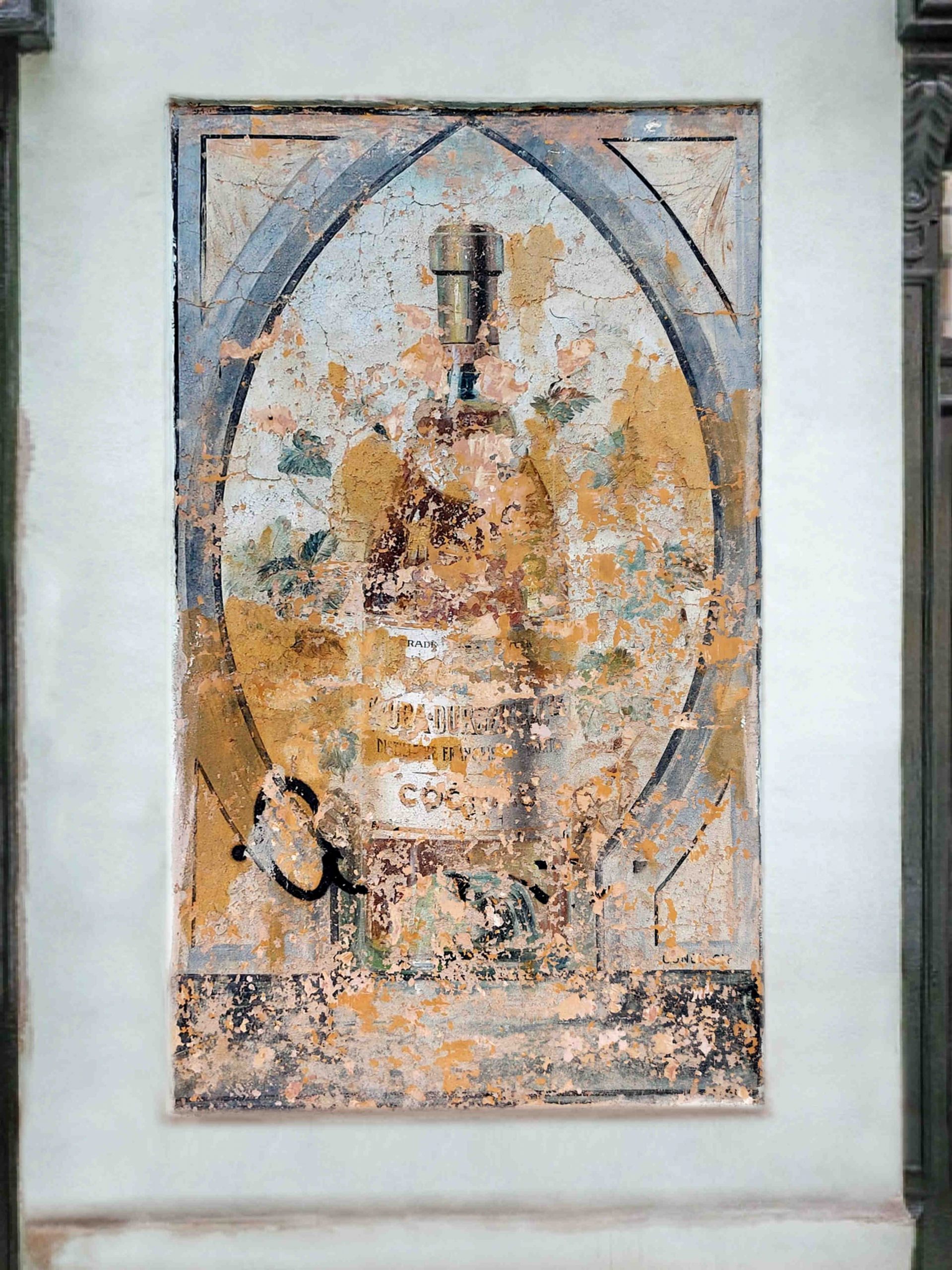 Fotografia color arată reclama la coniacul Czuba-Durozier de pe fațada clădirii str. Mitropoliei 26 (Fleischergasse), realizată în perioada antebelică pentru magazinul lui Hans Balthes.