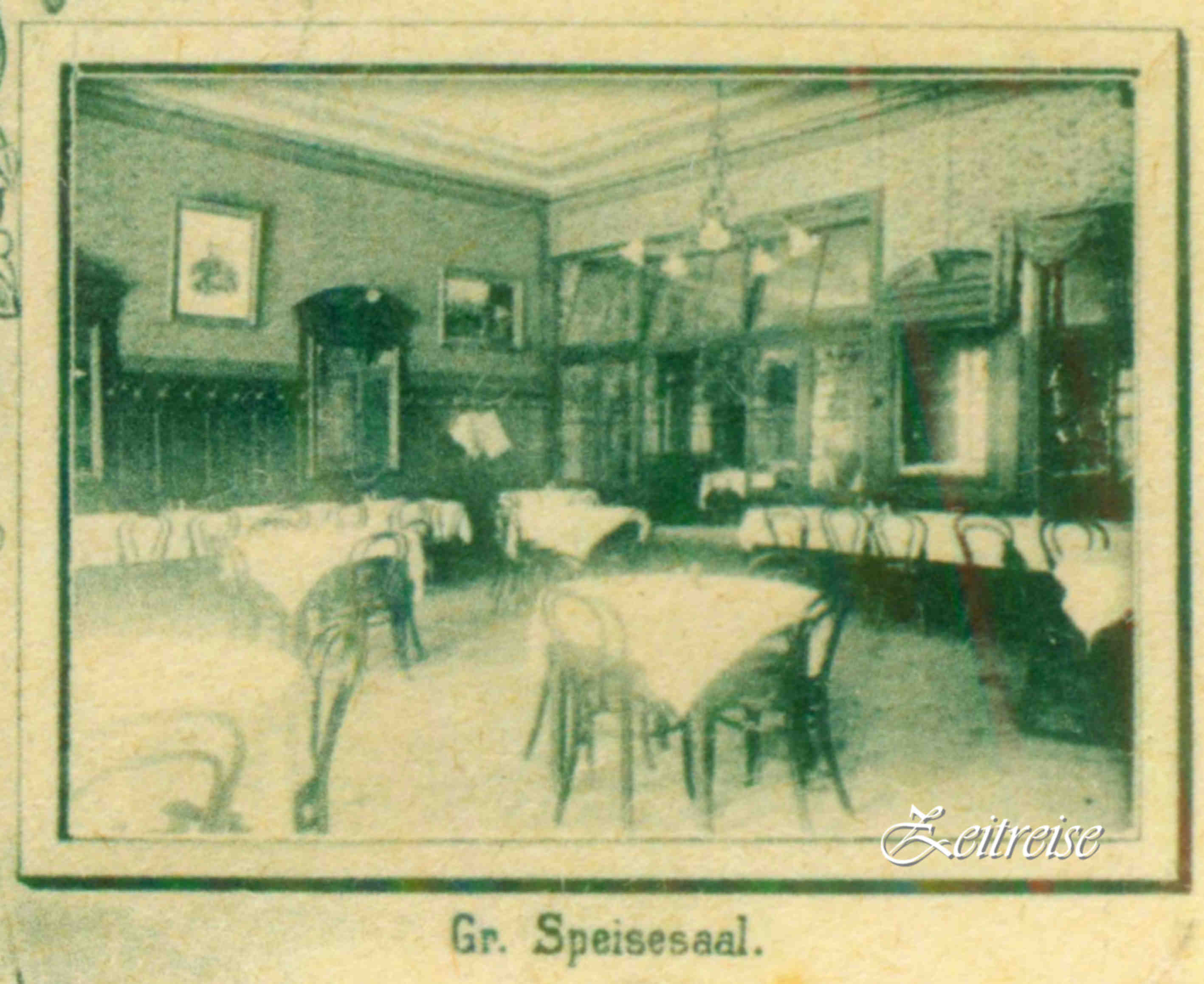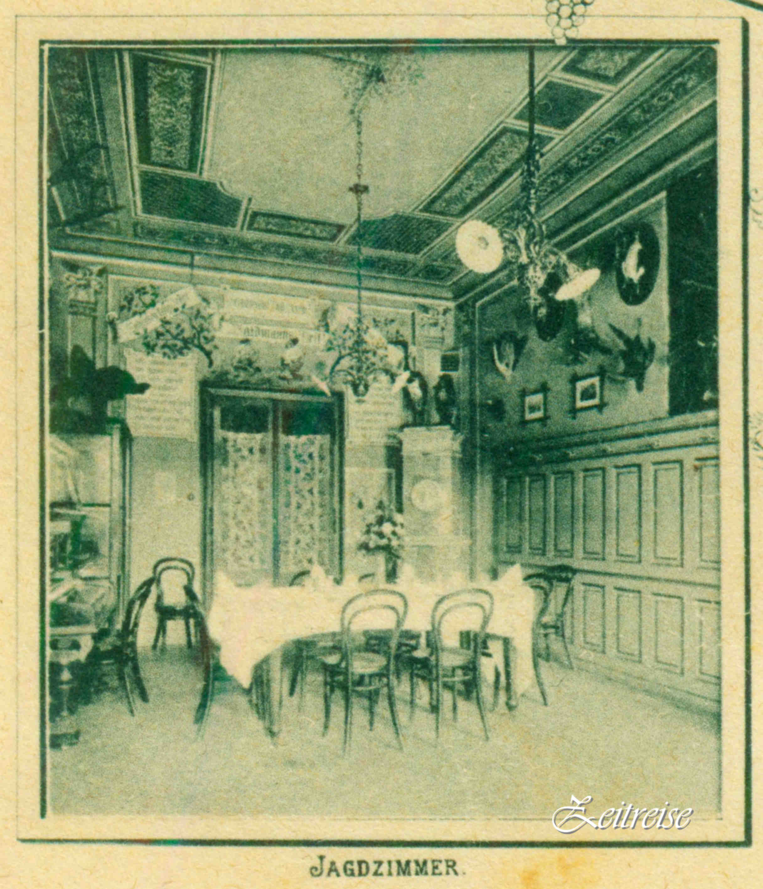 Mijlocul restaurantului îl ocupau camerele de masă: una specială mică şi intimă de mic dejun (Frühstück) probabil un separeu, un salon mic şi unul mai mare de servit masa şi camera cea mai impresionantă, cea cu trofee vânătoreşti, Camera Vânătorilor! Conform modei din sec. trecut, trofeele stăteau mîndre atîrnate pe pereţi şi ne putem imagina un meniu fastuos menit să impresioneze clientul şi să-ţi lase apă în gură doar la auzirea numelui: Gustarea Grofului (brânză mucegai, dulceaţă), Păstrăv „Franz Joseph“ (păstrăv, unt, migdale, vin alb, smântână), Cina Pădurarului (carne mistreţ, prune afumate, mere, cartof, vin roşu), Căprioară cu vişine, File Săsesc (file porc, ardei gras, ceapă, ciuperci, ardei iute, ceafă afumată, caşcaval), Papricaş de pui, Curcan Vienez, Supă de labă de urs, Sitari şi Prepeliţe umplute ori „la cratiţă“ şi alte multe mîncăruri mai modeste, dar la fel de apetisante: şniţele, gulaş, cîrnaţi şi fripturi de tot felul! Şi de intri pe o parte, pe cealaltă vei putea ieşi: poate pentru amanţi indragostitit cale bună de urmărit, sau pentru cei turmentaţi… un pic înşelătorie pură?! Aşa stă casa cu picioarele-n două străzi şi se joacă: o parte în grădina şi una în lumină!