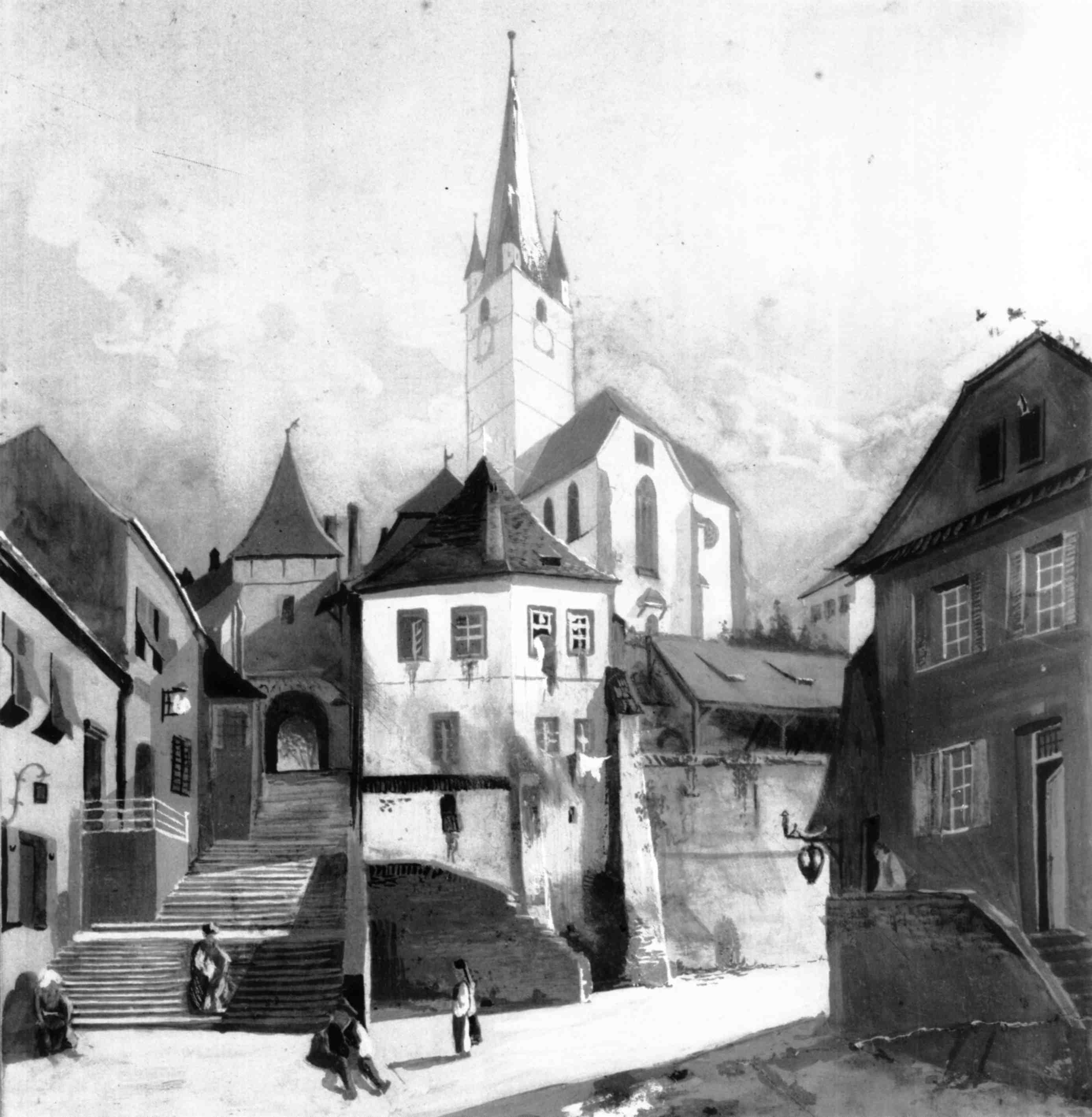 Scările Sag si Turnul Scărilor – tablou realizat după o pictură romantică din a doua jumătate a secolului al XIX-lea. (Sursa foto: „Alt-Hermannstadt“)