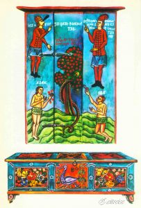 (jos) Ladă de zestre – începutul sec. al XIX-lea – Acuarele de Iuliana Fabritius-Dancu (Sursa foto: Almanah N.W.1973)