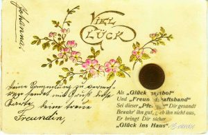 Moda vremii făcea ca, mici obiecte reclamă sau „amulete „, să fie lipite pe dreptunghiul de hîrtie şi trimise în chip de dar şi îmbărbătare.