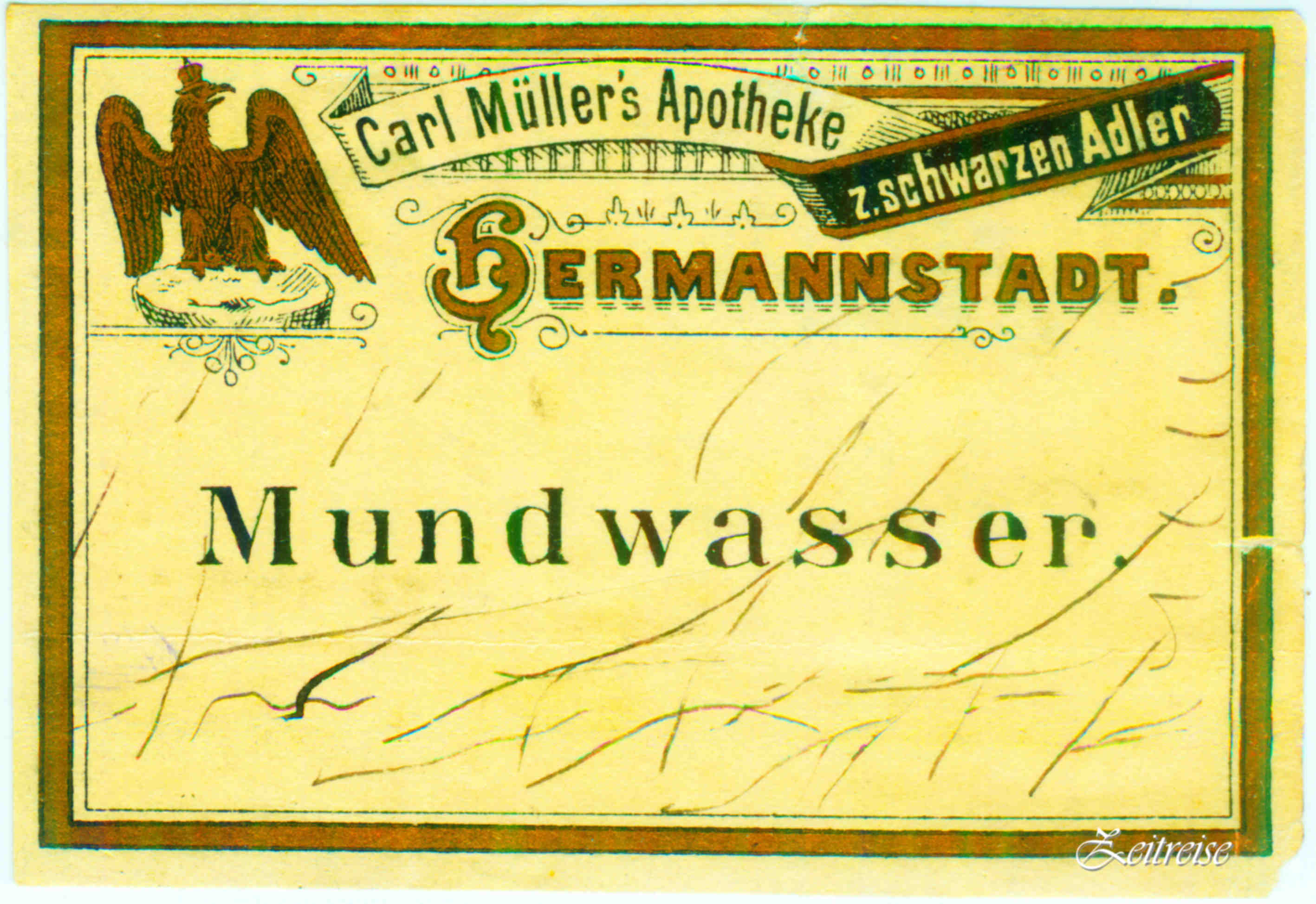 Iată eticheta unui recipient pentru „apă de gură“ cu emblema farmaciei lui Carl Müller „La Vulturul Negru“ (Zum Schwarzen Adler), prilej să ne amintim. Farmacia „La Vulturul Negru“ a functionat sub acest nume din 1704 pina la nationalizare in 1949.