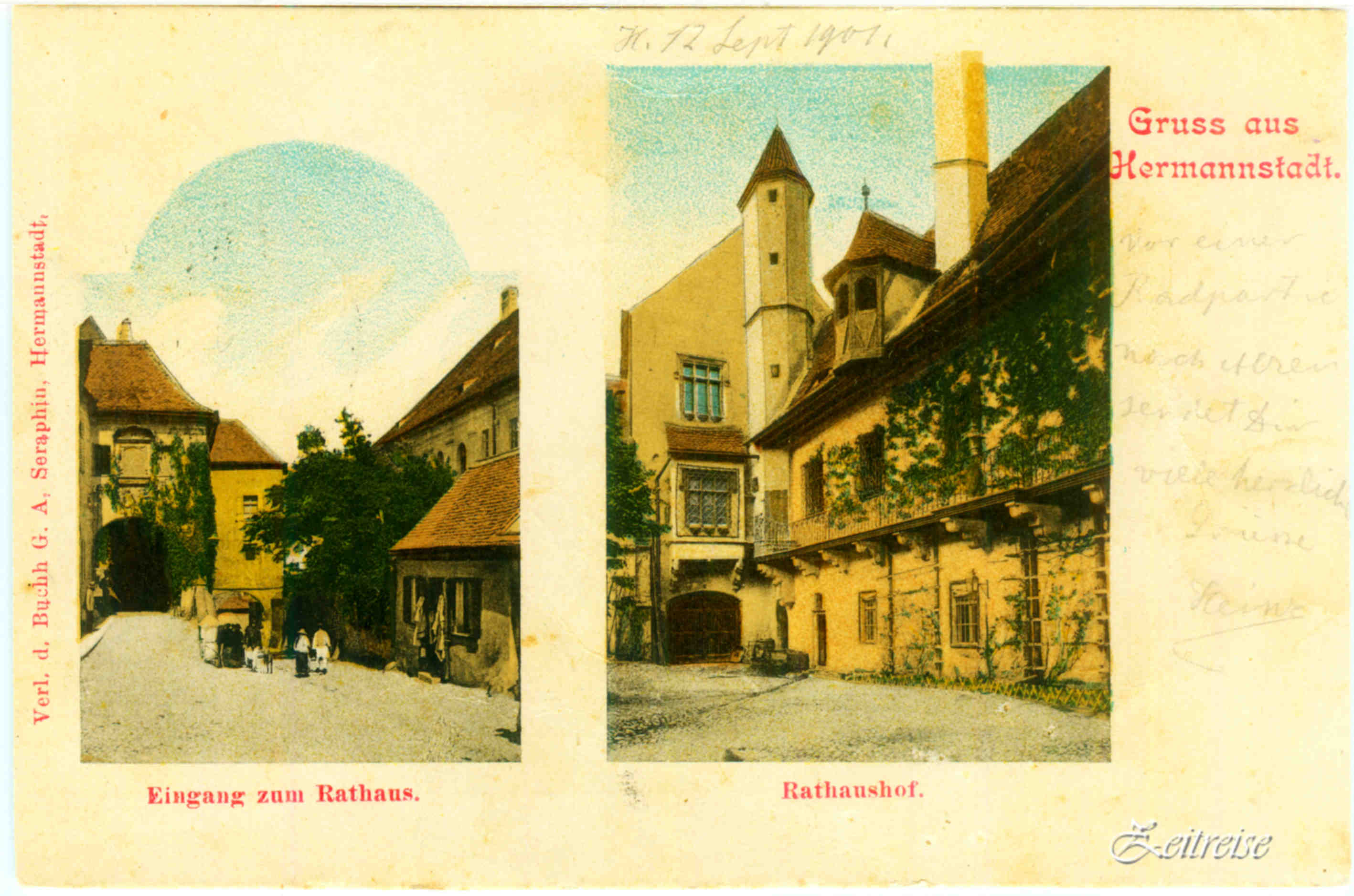 Călătorie ~ 2016, Călătorie în timp/ Zeitreise/ Időutazás 2016-08-09 / „Înaintea unui tur de bicicletă la Alţîna, îţi trimit multe salutări, Heinz“ „Salutări din Sibiu“ – „Vechea Primărie/Casa Altemberger // „Altes Rathaus/Altemberger Haus“ – Carte Poştală circulată 1901 Adriana Mosciki 1