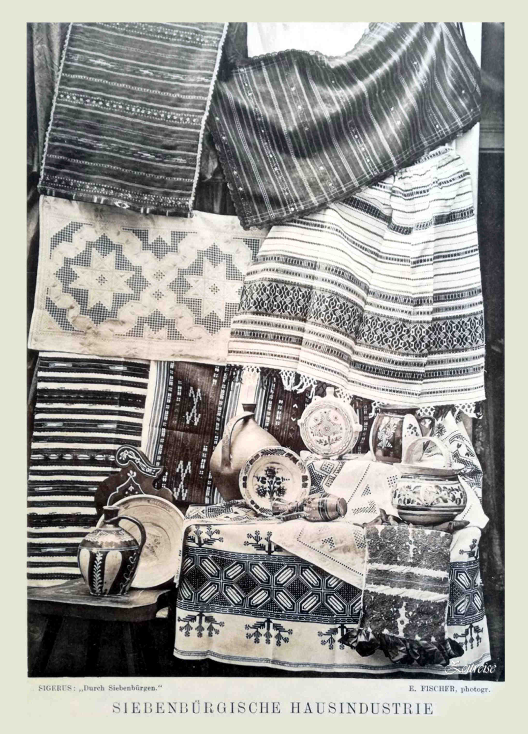 O fotografie banală dar cu tâlc, zic eu. Fischer o numeşte „artă manuală în Transilvania“ pentru că reprezintă obiecte meşterite pe teritoriul acesta: oale de lut smălţuite, pânzeturi ţesute în casă, ştergare, feţe de masă, scaune înflorate. Mâinile ce-au ţesut, cusut – scărmănă norii în lumea cea fără de griji, ochii ce-au cules mătasa după chipul florilor şi râurilor – închişi peste lume, gura ce le-a cântat şi descântat – mută… Obiectele toate, însă, poartă în ele amintirea şi măiestria facerii, frumuseţea locului şi autenticitatea lui. Pânzeturi româneşti, săseşti, ungureşti stau împreună şi vorbesc despre loc şi oameni, conturând un teritoriu şi o spiritualitate!