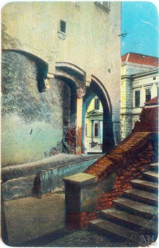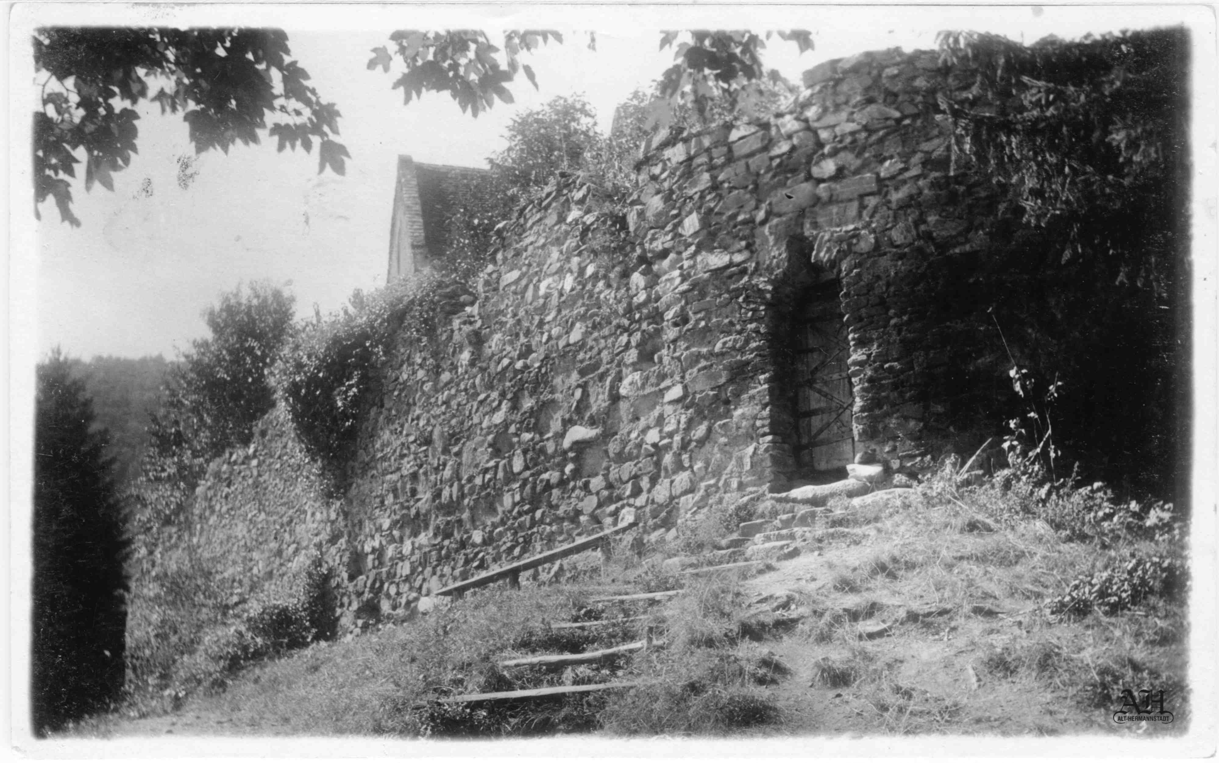 Carte poștală din perioada interbelică. Text verso: Orig. Fot. E. Fischer – Reproducere interzisă. / Burgeingang ~ Michelsberg / Intrarea în cetate ~ Cisnădioara.