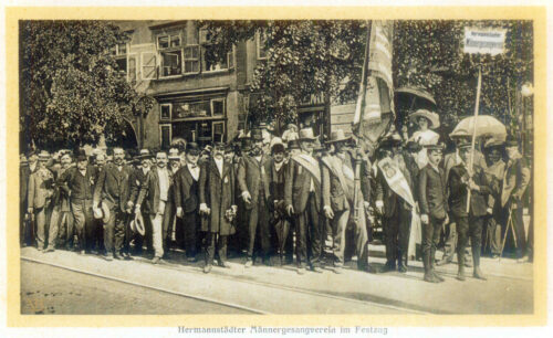 S. VEREIN FÜR NATURWISSENSCHAFTEN. și anul 1894 scris cu cifre romane MDCCCXCIV. (anul a supraviețuit).Clădirea Societății Ardelene pentru Științele Naturii inaugurată în 12 mai 1895 – foto Emil Fischer (anii 1930)