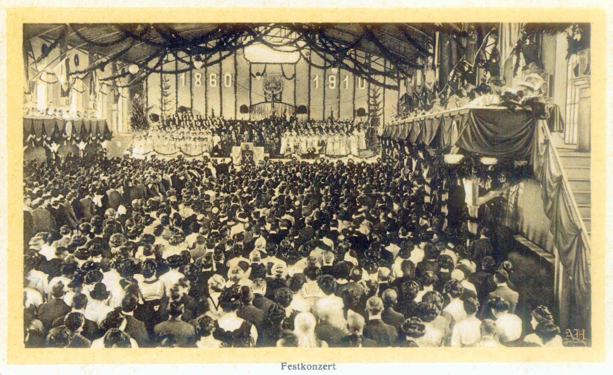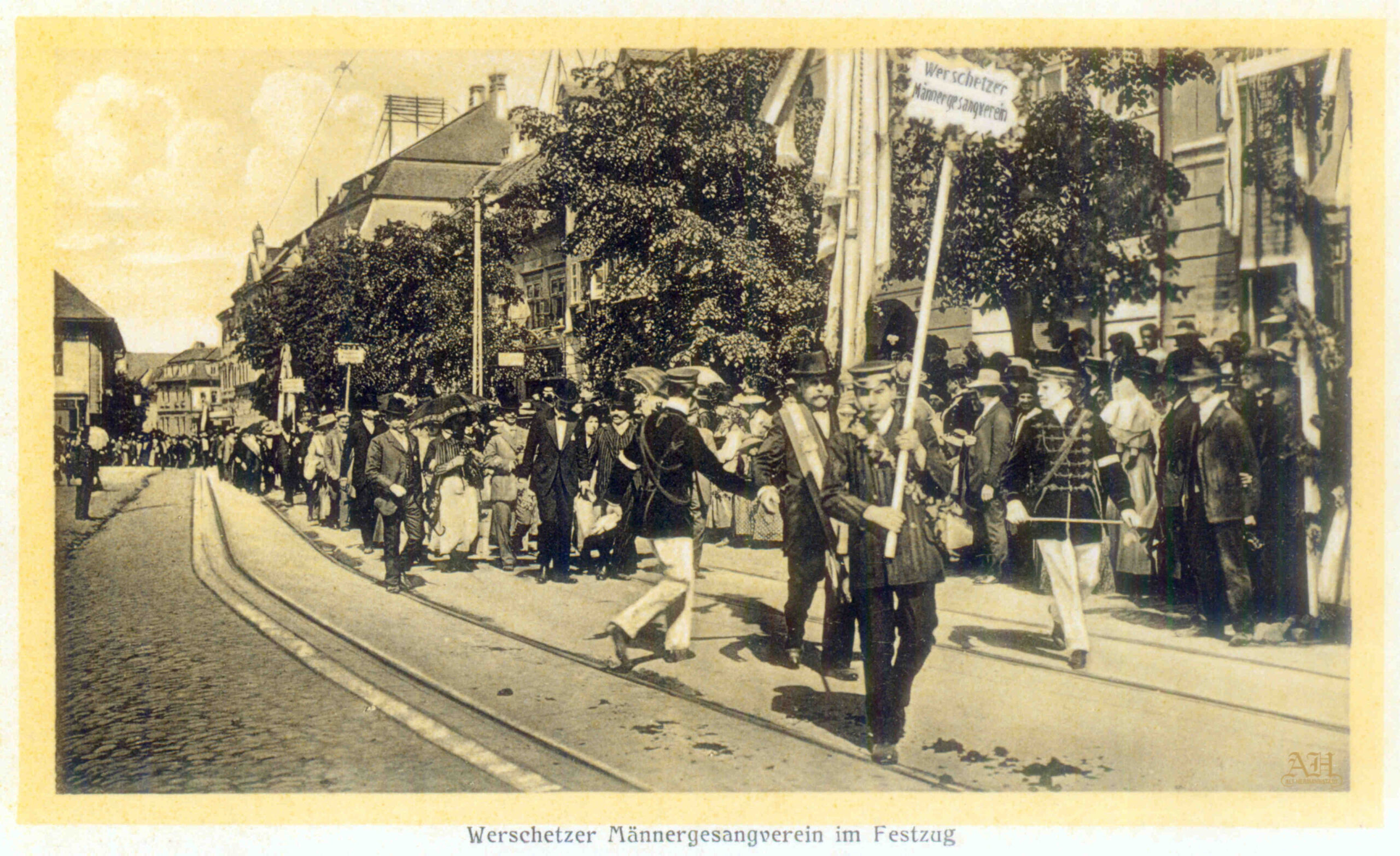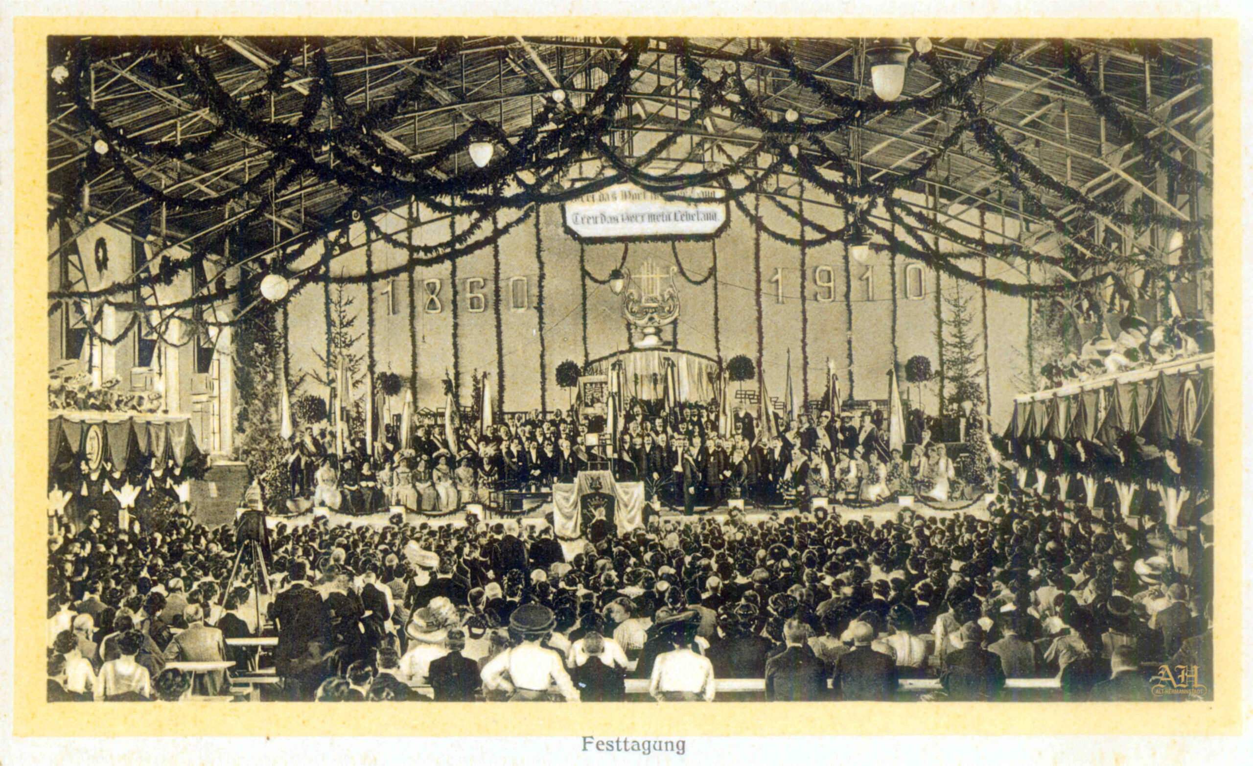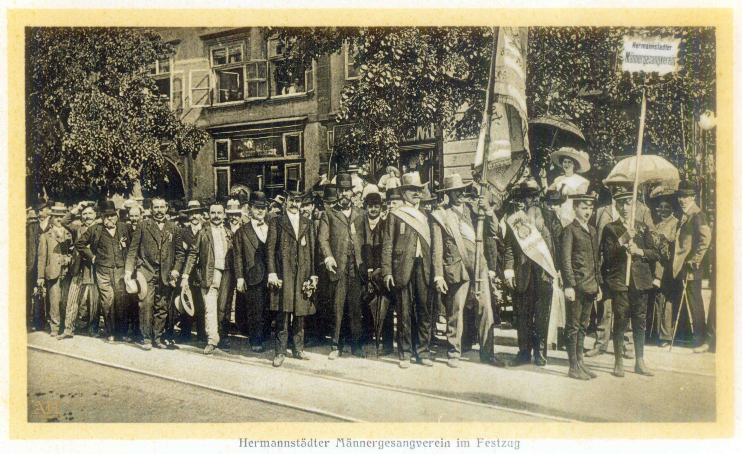 „Salutări din Sibiu – Parcul Sub Arini” – Parcul Sub Arini la sfârșitul anilor 1890 – fotografie din atelierul lui Emil Fischer. Carte poștală circulată noiembrie 1900. Editura / librăria Georg Mayer din Sibiu (Verlag v. Georg Mayer’s Buchhandlung, Hermannstadt)