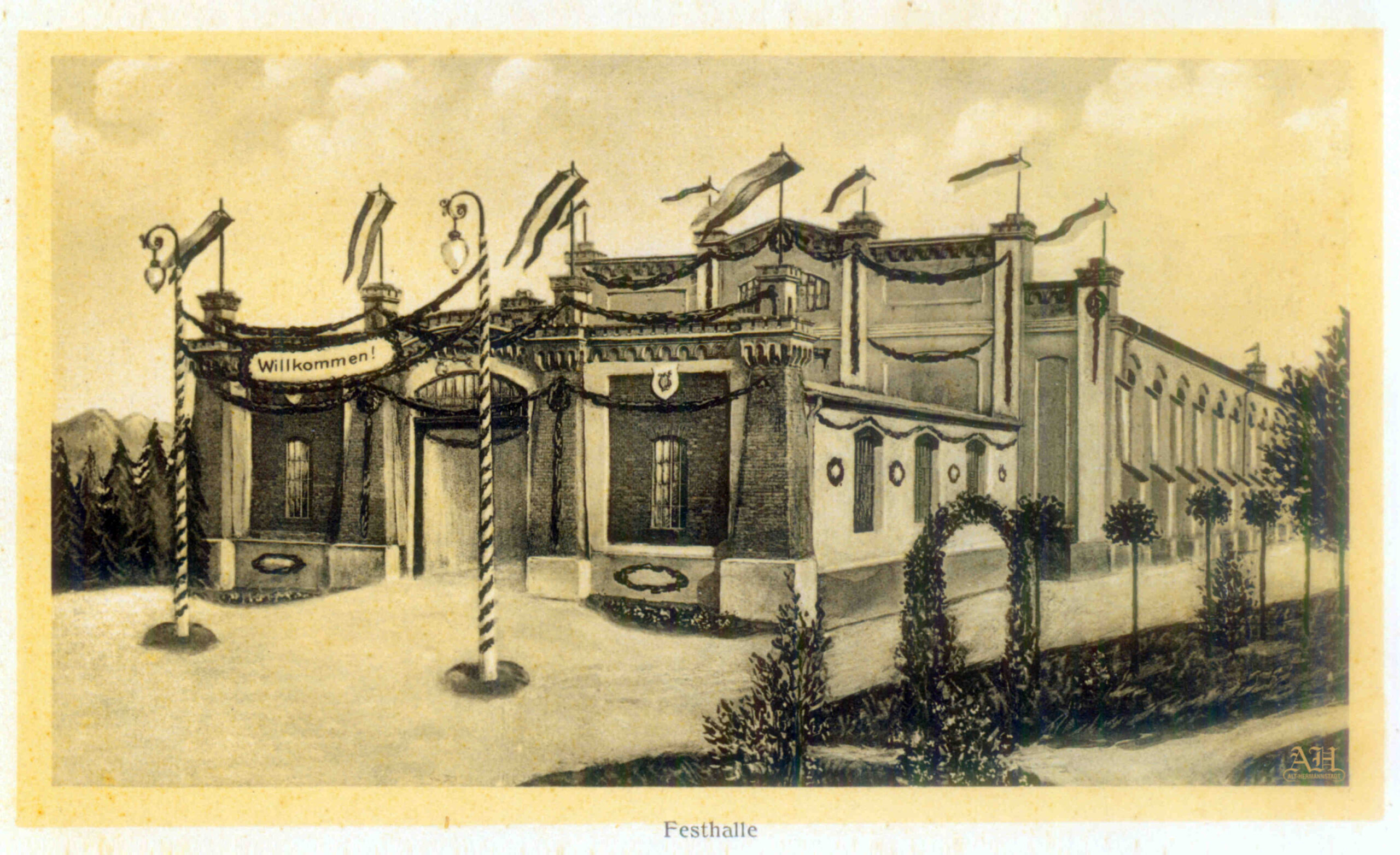 Antablamentul (atica) fațadei principale era inscripționat cu denumirea germană scrisă cu litere volumetrice: