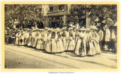 Țărance săsești îmbrăcate în port popular stând în fața bisericii din Lechnița // Lechnitz // Szászlekence. Carte poștală tip „Mimosa“ editată 1942. Fotofrafie realizată de Josef Fischer. Text verso: „Țărance săsești din Lechnița // Sachsische Bäuerinnen vor der Kirche in Lechnitz / Foto orig. J. Fischer, Sibiu 1942“.