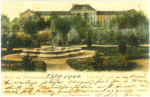 „Gruss aus Hermannstadt – Partie im Erlenpark” – Erlenpark in den späten 1890er Jahren. Hinter der Erlenpromenade befindet sich das K.u.K. Garnisonsspital. Das Foto wurde in Emil Fischers Fotostudio zu Hermannstadt hergestellt. Postkarte aus dem „Verlag v. Georg Mayer’s Buchhandlung, Hermannstadt” – gelaufen 1900 (23 November) -