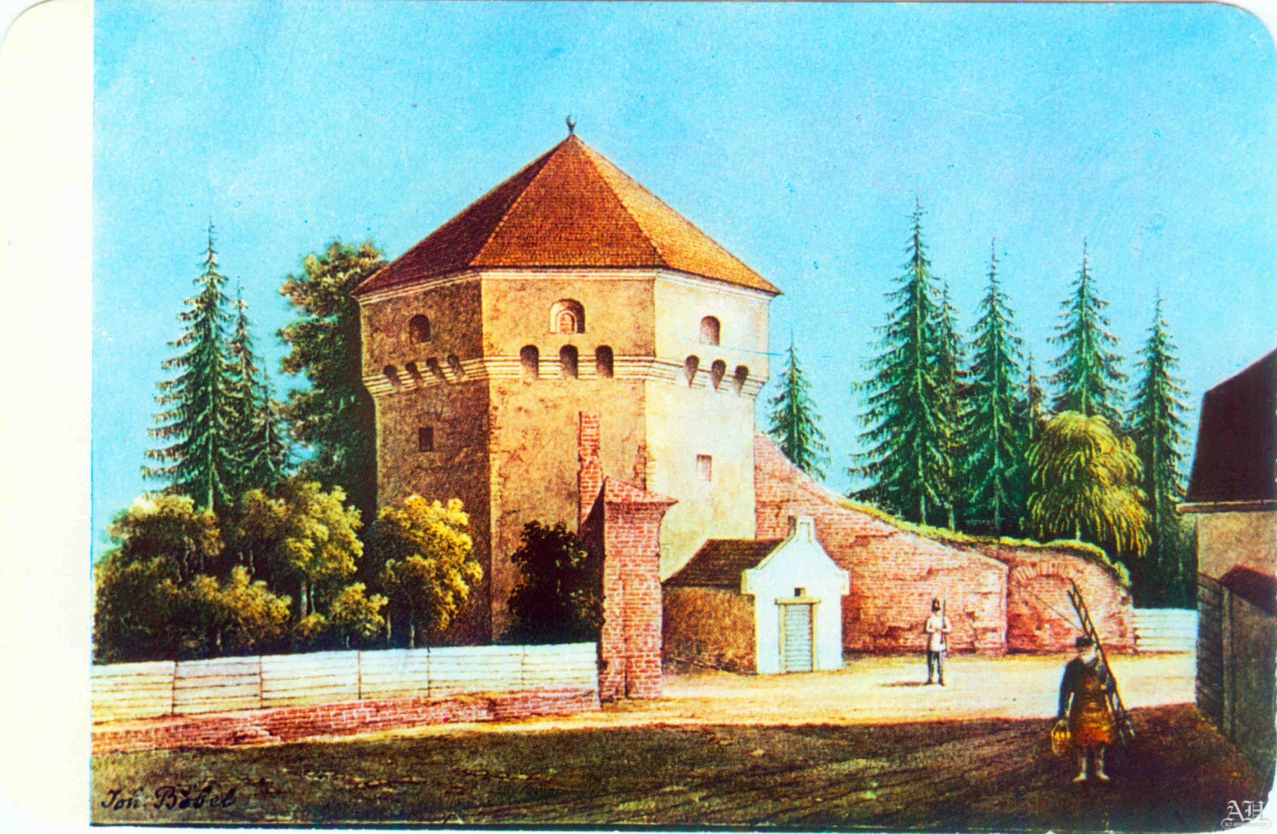 „Turn de apărare lângă Poarta Cisnădiei” – turnul se afla în zona Parcul Astra, în față clădirii str. Ioan Lupaș nr.4. (sursa ilustrație: „Alt-Hermannstadt“)
