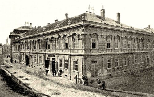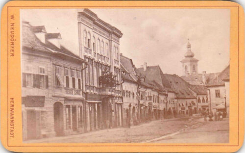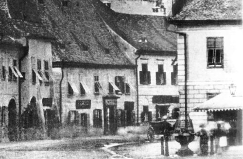 „Das Stühlerische Haus in Hermannstadt vor seiner Abtragung 1897” // „Casa Stühler din Sibiu înainte de a fi demolată în 1897”
