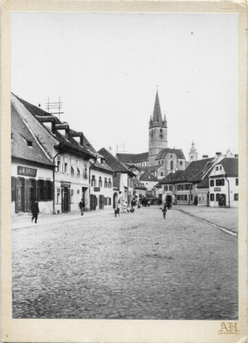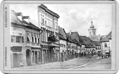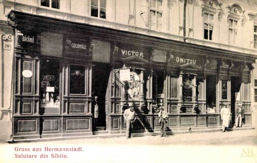 Dreapta: Strada Fleischergasse // Măcelarilor / Mitropoliei fotografiată de fotograful sibian Emil Fischer în primul deceniu al secolului al XX-lea (aproximativ 1905).Strada Fleischergasse // Măcelarilor / Mitropoliei fotografiată de fotograful sibian Emil Fischer în primul deceniu al secolului al XX-lea (aproximativ 1905). Detaliu sepia și alb-negru cu magazinul lui Victor Onițiu.