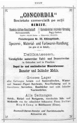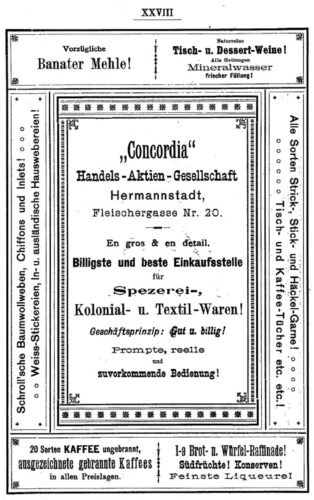 Dreapta: Reclamă comercială din cartea de adrese din 1901, la magazinul societății comerciale pe acțiuni „Concordia” care funcționa la parterul clădirii băncii Albina, strada Fleischergasse / Măcelarilor nr. 20, ( azi Mitropoliei 16 ).Vă oferim aici textul reclamei comerciale din 1898, urmat de traducerea în limba română: