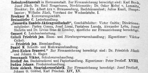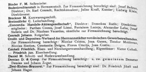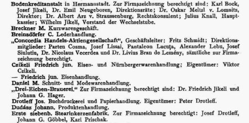 Dreapta: Societătatea comercială pe acțiuni „Concordia” listată în cartea de adrese din 1901: „Concordia Handels-Aktiengesellschaft”, Geschäftsleiter : Fritz Schmidt ; Drektionsmitglieder : Parten Cosma, Josef Lissai, Pantaleon Lucuța, Alexander Lebu, Josef Siulutiu und Dr. Nicolaus Vecerdea und Dr. Livius Bran de Lemény, sämtliche zur Firmenzeichnung berechtigt.~~~o~~~