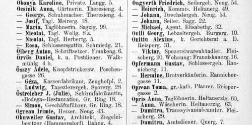 Dreapta: În cartea de adrese din 1908, magazinul lui Victor Onițiu este listat la adresa strada Fleischergasse Nr. 20 / Măcelarilor nr. 20, ( azi Mitropoliei 16 ), iar comerciantul Victor Onițiu apare cu adresa de domiciliu strada Franziskanerg(asse) 16, ( azi strada Șelarilor 5 ): Onițiu Victor, Spezereiwarenhändler, Fleischergasse 20. Wohnung: Franziskanerg(asse) 16.~~~o~~~