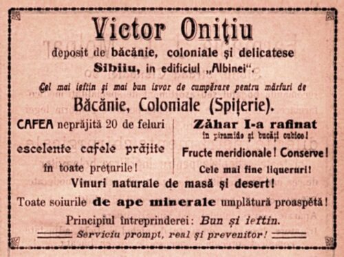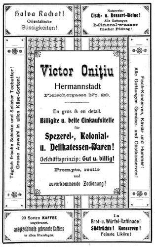 Stânga: Reclamă comercială din cartea de adrese din 1908, la magazinul cu depozit produse de băcănie, delicatese și mărfuri de coloniale ( spițerie ) Victor Onițiu care a funcționat la parterul clădirii băncii Albina, strada Fleischergasse Nr. 20 / Măcelarilor nr. 20, ( azi Mitropoliei 16 ).