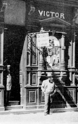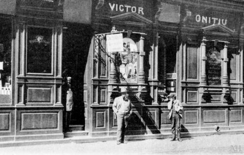 Dreapta: Detaliu alb-negru cu ușa de intrare în magazinul lui Victor Onițiu din fotografia realizată de Emil Fischer în primul deceniu al secolului al XX-lea (aproximativ 1905). Nu este exclus ca domnul cu pălărie să fi fost, însuși, Victor Onițiu.Vă oferim aici textul reclamei comerciale din 1908, urmat de traducerea în limba română: