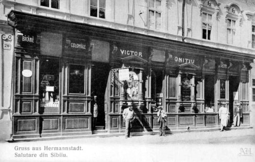 Carte poștală ilustrată realizată în primul deceniu al secolului al XX-lea ( după 1904, probabil 1908 ) în care apare magazinul lui Victor Onițiu, aflat la parterul clădirii băncii „Albina”. Din păcate, textele vizibile în partea superioară a magazinului au fost scrise cu peniță pe negativul fotografiei, fapt care îngreunează datarea acesteia.
