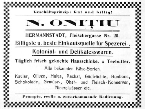 Dreapta: Reclamă comercială din cartea de adrese din 1911, la magazinul lui N. Onițiu, strada Fleischergasse Nr. 20 / Măcelarilor nr. 20, ( azi Mitropoliei 16 )! -