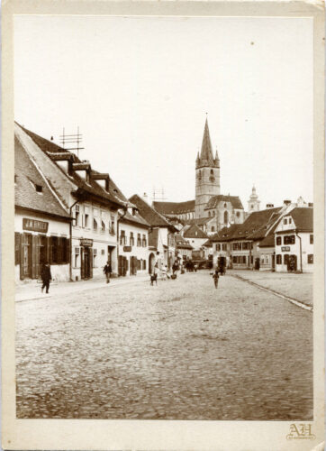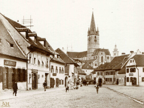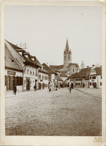 Strada Turnului din Sibiu, cu Biserica Evanghelică în fundal, fotografiată în jurul anului 1896 de la intersecția cu strada Valea Mare. Fotografia originală, 159×118 mm, este lipită pe un suport de carton, 178×128 mm.