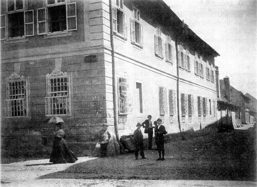 Aceste două fotografii istorice au fost realizate în 1897, cu ocazia demolării a patru clădiri, dintr-e care trei erau situate pe strada General Magheru // Sporergasse ( numere vechi 6, 8, 10 ) și una pe str. George Lazăr // Reissenfelsgasse ( nr.1 ). Pe cele patru parcele libere s-a construit între 1897 și 1899 noul Gimnaziu maghiar de stat conform planurilor arhitectului maghiar Ignác Alpár. De la introducerea limbii române de predare în anul școlar 1919/20 gimnaziul poartă denumirea „Liceul Gheorghe Lazăr”.