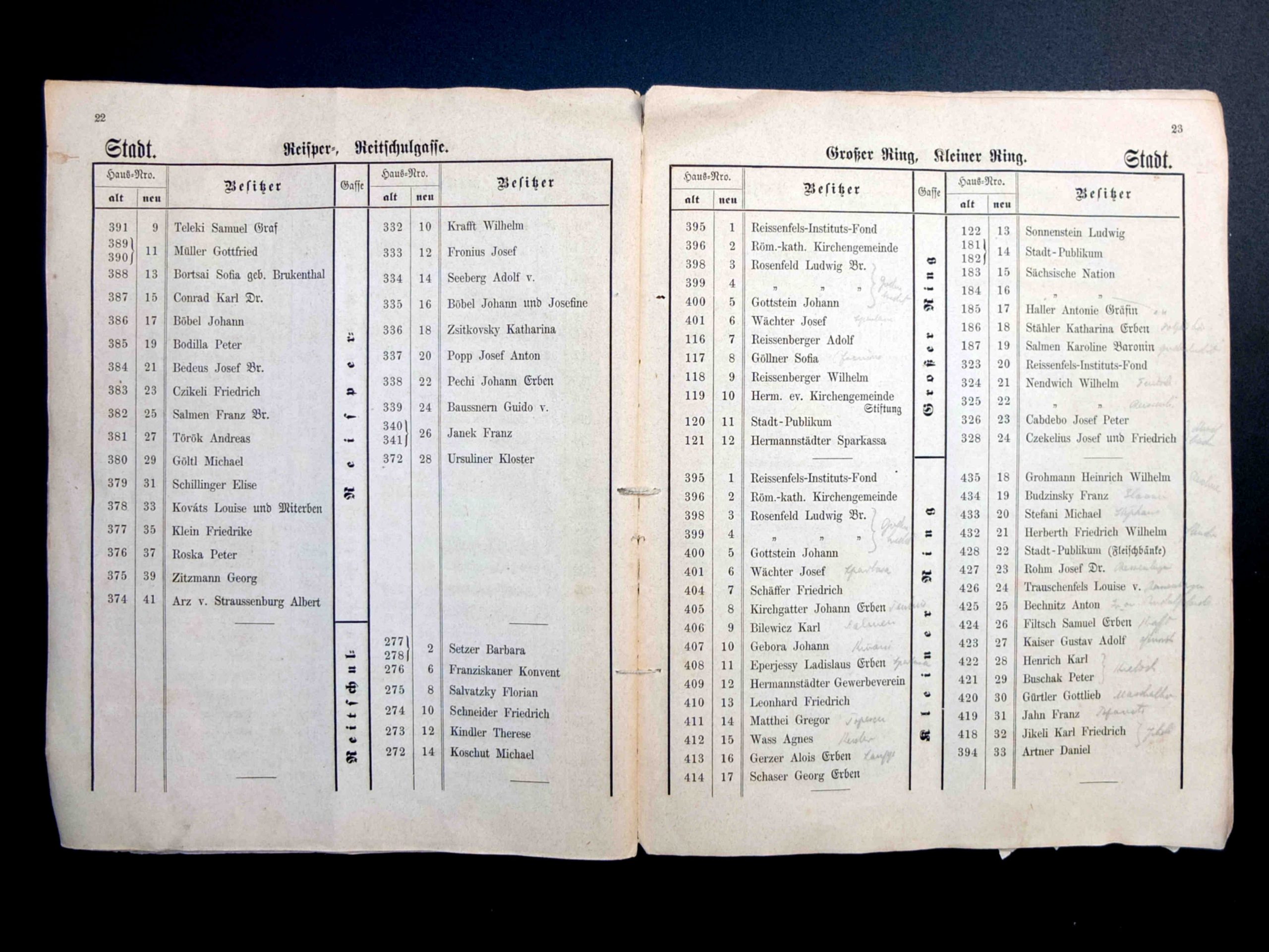 Dreapta: În cartea de adrese din 1908, magazinul lui Victor Onițiu este listat la adresa strada Fleischergasse Nr. 20 / Măcelarilor nr. 20, ( azi Mitropoliei 16 ), iar comerciantul Victor Onițiu apare cu adresa de domiciliu strada Franziskanerg(asse) 16, ( azi strada Șelarilor 5 ): Onițiu Victor, Spezereiwarenhändler, Fleischergasse 20. Wohnung: Franziskanerg(asse) 16.~~~o~~~