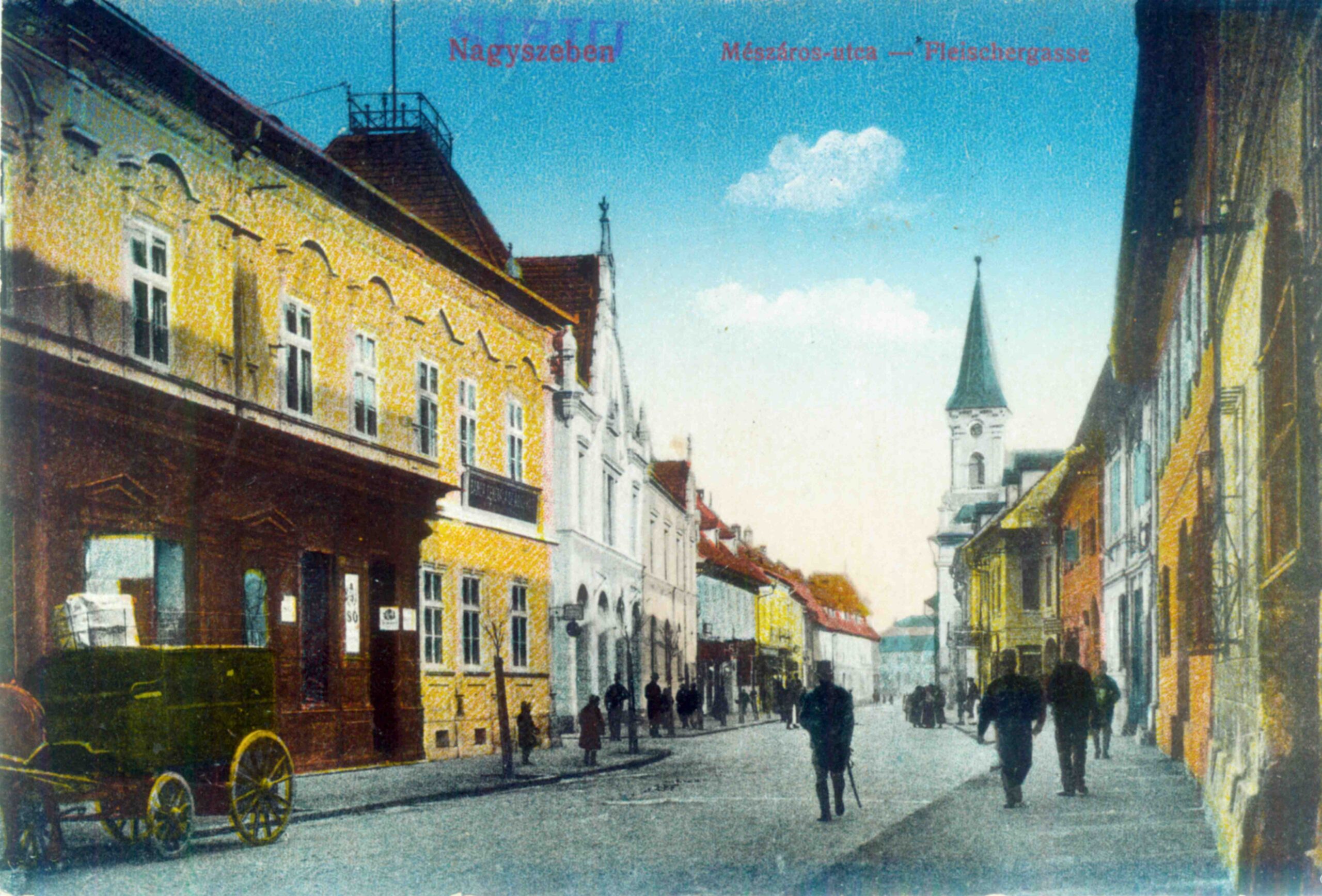 Dreapta: Strada Fleischergasse // Mészáros-utca // Măcelarilor / Mitropoliei fotografiată în al doilea deceniu al secolului al XX-lea, în jurul anului 1915.~~~o~~~