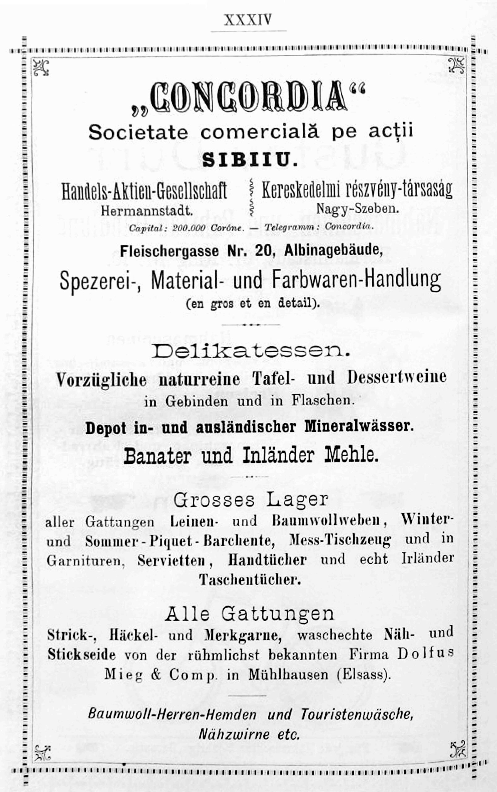 Dreapta: Reclamă comercială din cartea de adrese din 1901, la magazinul societății comerciale pe acțiuni „Concordia” care funcționa la parterul clădirii băncii Albina, strada Fleischergasse / Măcelarilor nr. 20, ( azi Mitropoliei 16 ).Vă oferim aici textul reclamei comerciale din 1898, urmat de traducerea în limba română: