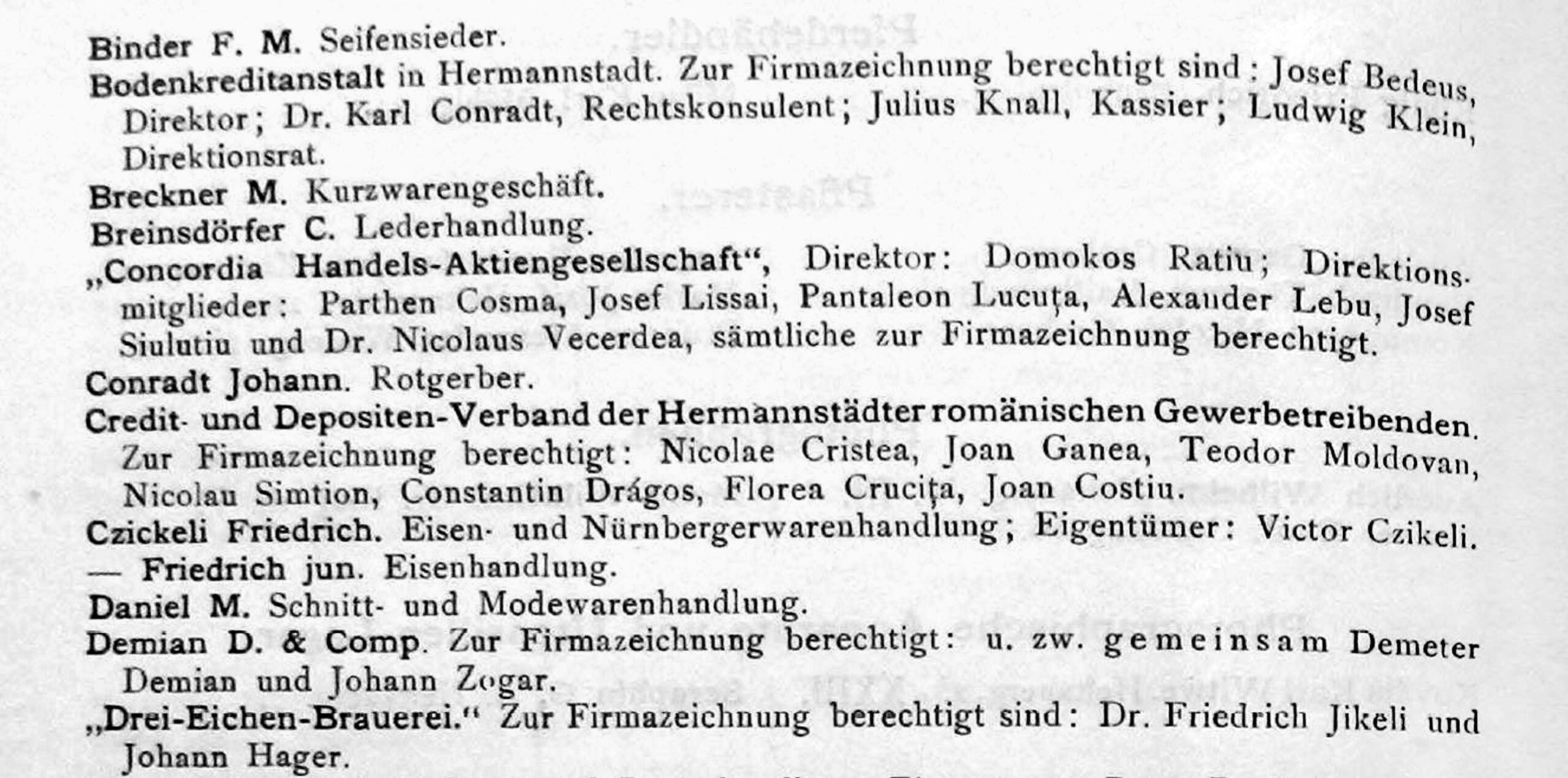 Dreapta: Societătatea comercială pe acțiuni „Concordia” listată în cartea de adrese din 1901: „Concordia Handels-Aktiengesellschaft”, Geschäftsleiter : Fritz Schmidt ; Drektionsmitglieder : Parten Cosma, Josef Lissai, Pantaleon Lucuța, Alexander Lebu, Josef Siulutiu und Dr. Nicolaus Vecerdea und Dr. Livius Bran de Lemény, sämtliche zur Firmenzeichnung berechtigt.~~~o~~~