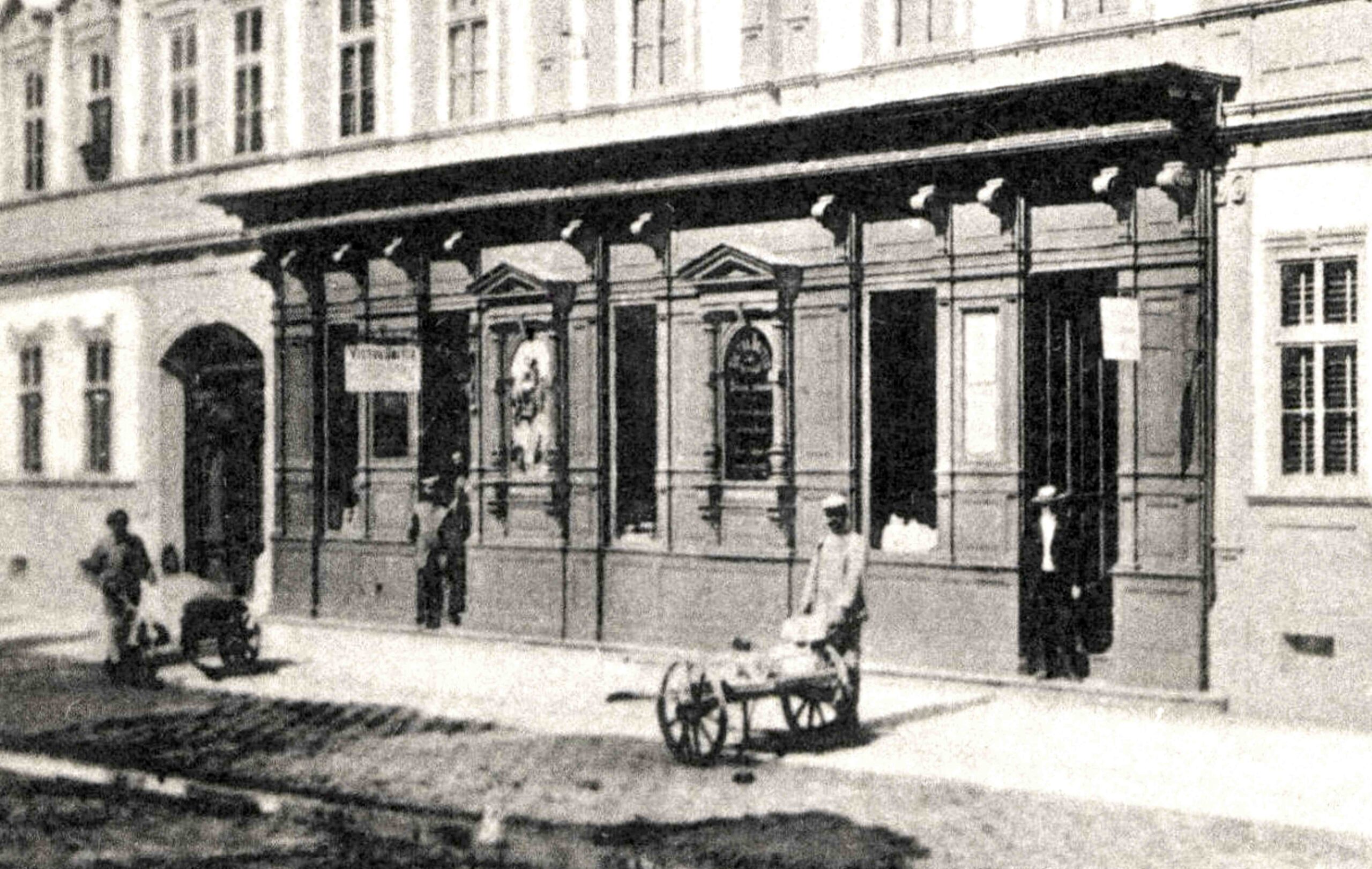 Dreapta: Detaliu alb-negru cu ușa de intrare în magazinul lui Victor Onițiu din fotografia realizată de Emil Fischer în primul deceniu al secolului al XX-lea (aproximativ 1905). Nu este exclus ca domnul cu pălărie să fi fost, însuși, Victor Onițiu.Vă oferim aici textul reclamei comerciale din 1908, urmat de traducerea în limba română: