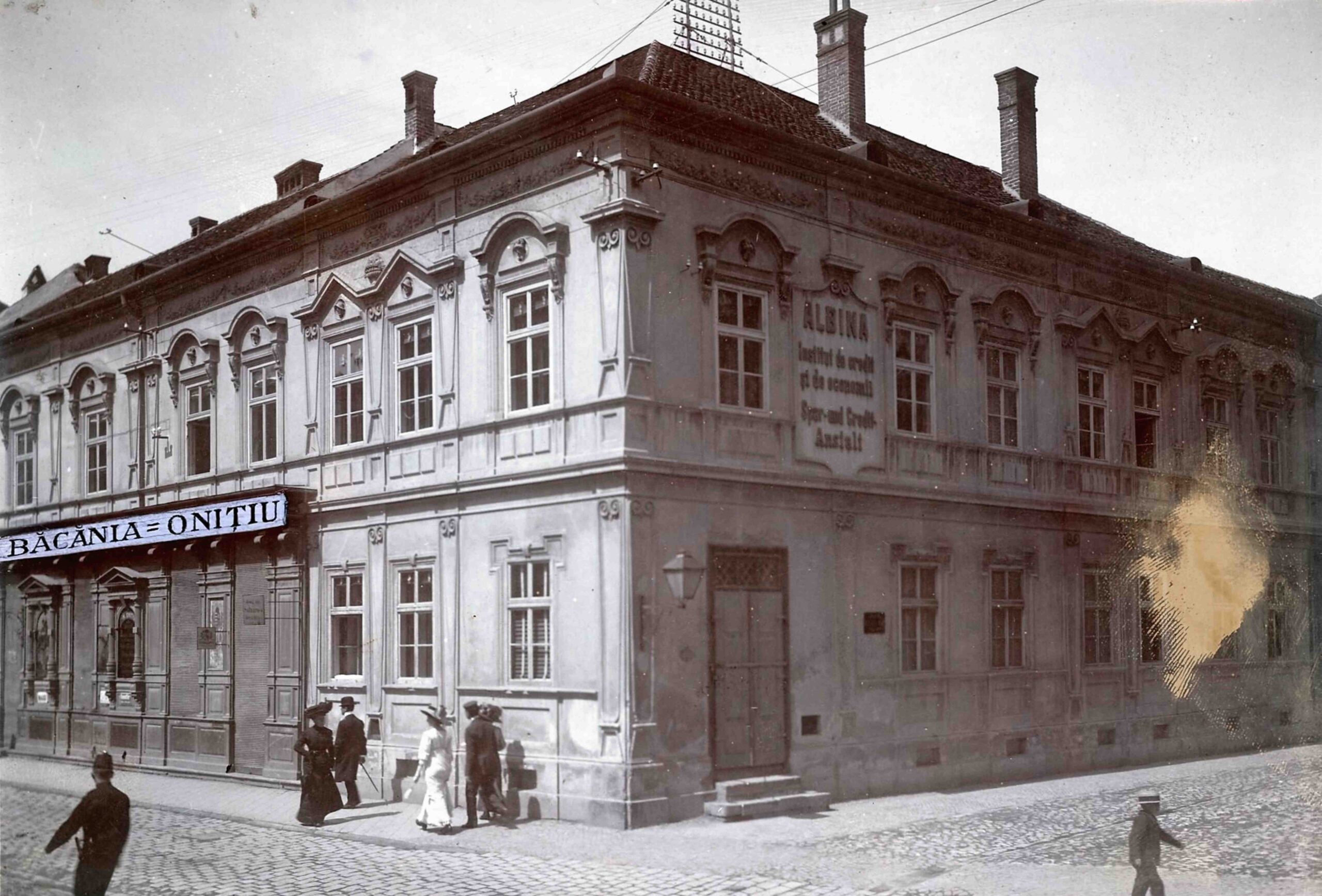 Clădirea de colț, strada Mitropoliei cu strada Poștei a fost ridicată în 1882 de banca Albina pe două parcele vechi: Fleischergasse No. 20 și Baiergasse No. 1 ( azi, strada Poștei ). Vechea clădire de pe parcela 20, în care a funcționat în secolele XVII-XIX hanul Curtea Sighișoarei // Schäßburger Herrnhof, a fost integrată în noul edificiu ( vezi acoperișul corpului de clădire spre strada Mitropoliei ).În cartea de adrese, 1887, la capitolul „Spezereiwarenhändler” ( comerciant produse spițerie ) este listat comerciantul Franz Klein, la adresa strada Măcelarilor // Fleischergasse nr. 20 / Mitropoliei 16.