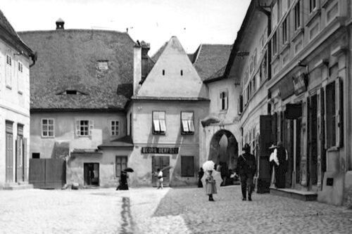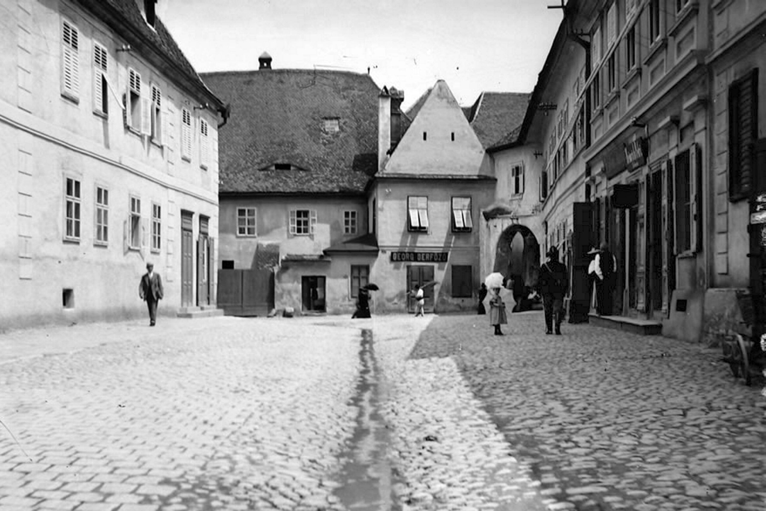 Instantaneu realizat în jurul anului 1885 pe strada Mitropoliei // Fleischergasse // Mészáros utca în Sibiu. În fundal se vede clădirea cunoscută sub denumirea de Casa Thomas Gulden și casa cu trecerea boltită prin care se ajungea în Piața Mare, dar și în pasajul care lega strada Mitropoliei de Piața Huet pe sub Turnul Preoților.