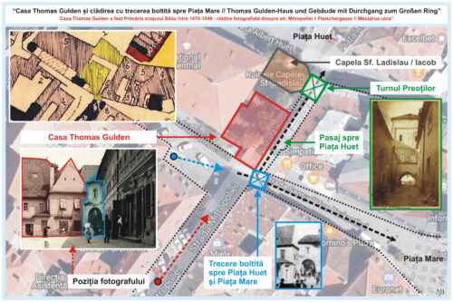 „Das Thomas Gulden Haus von der Fleischergasse // Mitropoliei-Straße // Mészáros-utca aus gesehen” // „Casa Thomas Gulden văzută dinspre str.Mitropoliei // Fleischergasse // Mészáros-utca”