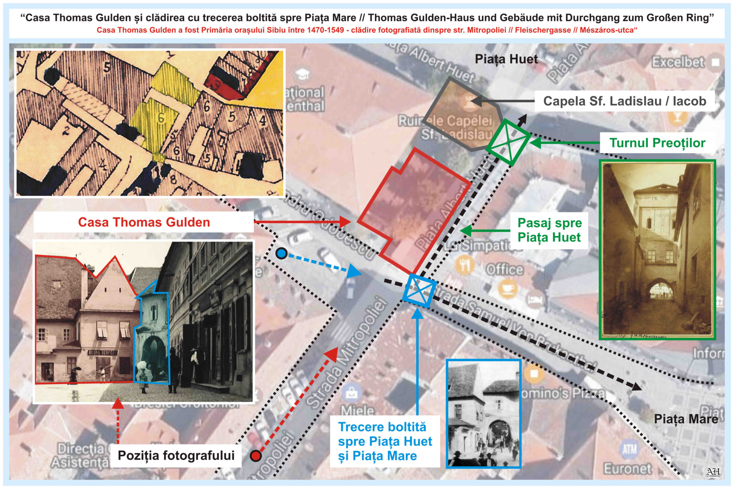 În anul 1470 Thomas Gulden donează casa sa situată lângă Turnul Preotilor drept sediu al Primăriei. În anul 1549 orașul vinde clădirea pentru 800 guldeni/ galbeni lui Gallus Lutsch și cumpără casa lui Markus Pempflinger cu 1922 guldeni și 64 dinari pentru noul sediu al Primăriei, astăzi Casa Altemberger. Casa Thomas Gulden, casa cu trecerea boltită, Turnul Preoților, capela și pasajul spre Piața Huet au fost demolate în vara anului 1898.