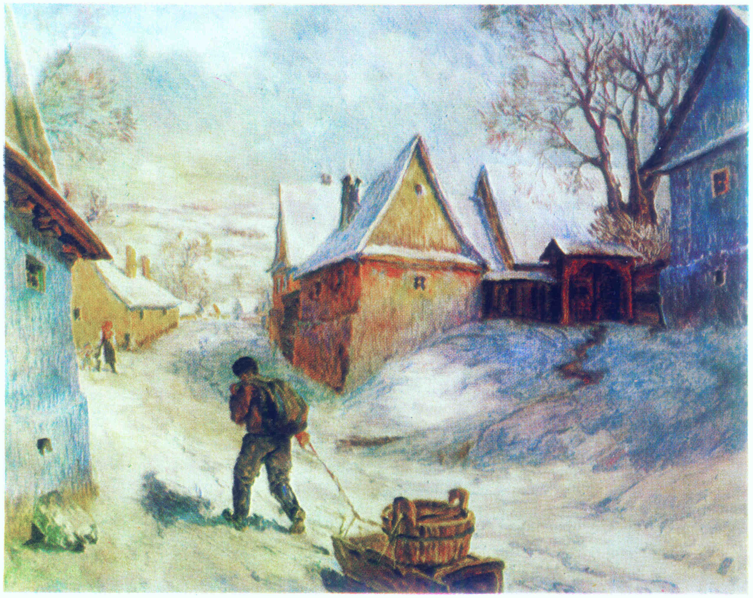 Drum sătesc din Cacova Sibiului, ( germană, Krebsbach / maghiară, Szebenkákova ). Peisaj de iarnă realizat 1951 de renumitul pictor sibian Hans Hermann, ( * 25 ianuarie 1885 în Brașov, Transilvania, Austro-Ungaria; † 13 februarie 1980 în Sibiu, Transilvania, România ).