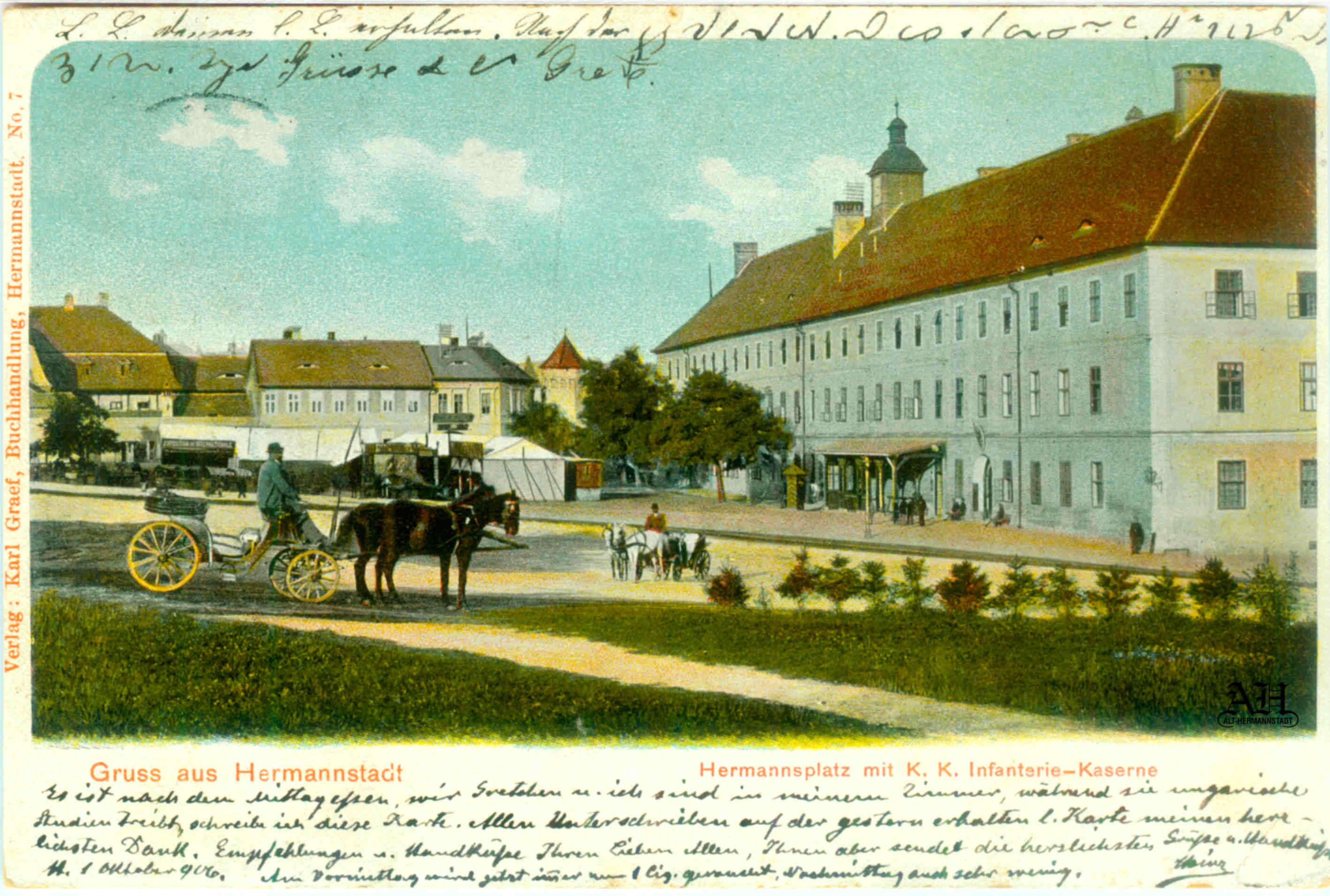 „Gruss aus Hermannstadt – Hermannsplatz mit K.K. Infanterie-Kaserne“ Anfang des 20. Jh. Postkarte Typ LEVELEZÖ LAP herausgegeben vom Hermannstädter Verlag „Karl Graef, Buchandlung“ – gelaufen 1906..