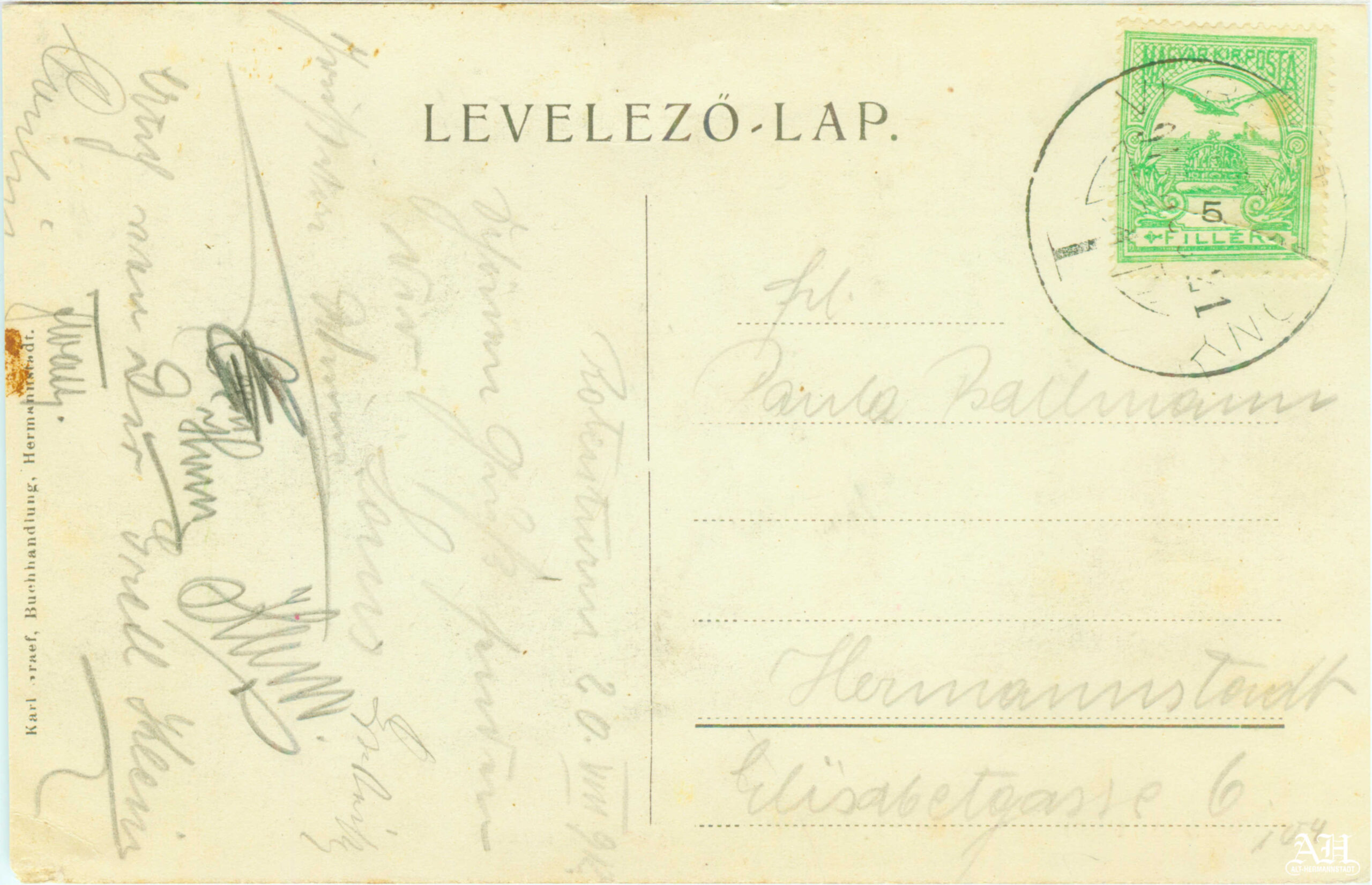 Această frumoasă carte poștală ilustrată, tip LEVELEZÖ-LAP, este datată 20 august 1912 și a circulat între Turnu Roșu și Sibiu. Destinatara era domnișoara Paula Ballmann, domiciliată pe strada Elisabethgasse nr.6. Am cunoscut-o personal pe dna Paula Ballmann, numită Paulatante. A decedat în anii 1970.