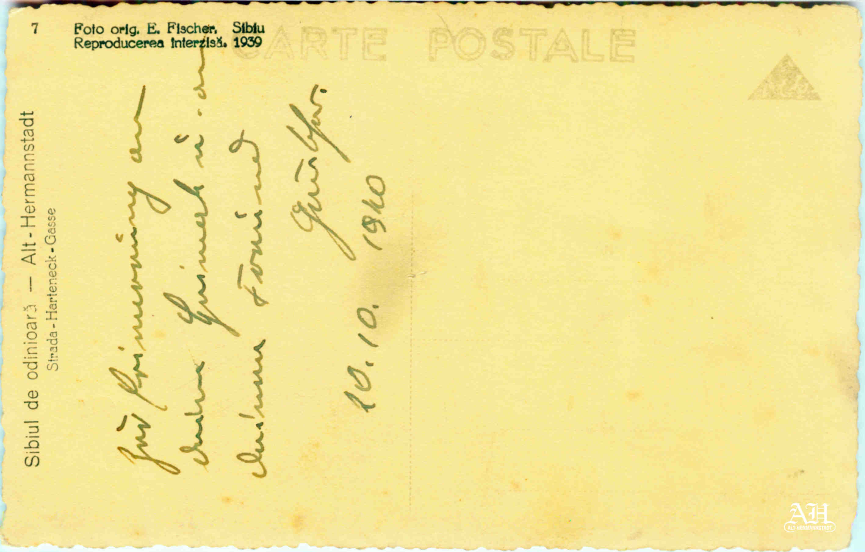 Alt-Hermannstadt // Sibiu // Nagyszeben, Emil & Josef Fischer „Harteneck Gasse“ // „Strada Harteneck“ / Sibiul de odinioară – Alt-Hermannstadt – Strada-Harteneck-Gasse / carte poștală editată 1939 – autorul fotografiei Emil Fischer 0