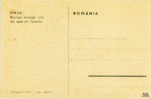 Carte poștală tiparita la tipografia PROGRESUL Sibiu. Text verso: SIBIU Biserica evangh. luth. din spre str. Turnului / „Progresul“ Sibiu – Repr. Oprită. Intreprinderea Progresul a funcționat din 1944 până la naționalizare 1948 în clădirile fostei tipografii Krafft & Drotleff S.A. str. Regina Maria nr. 23.