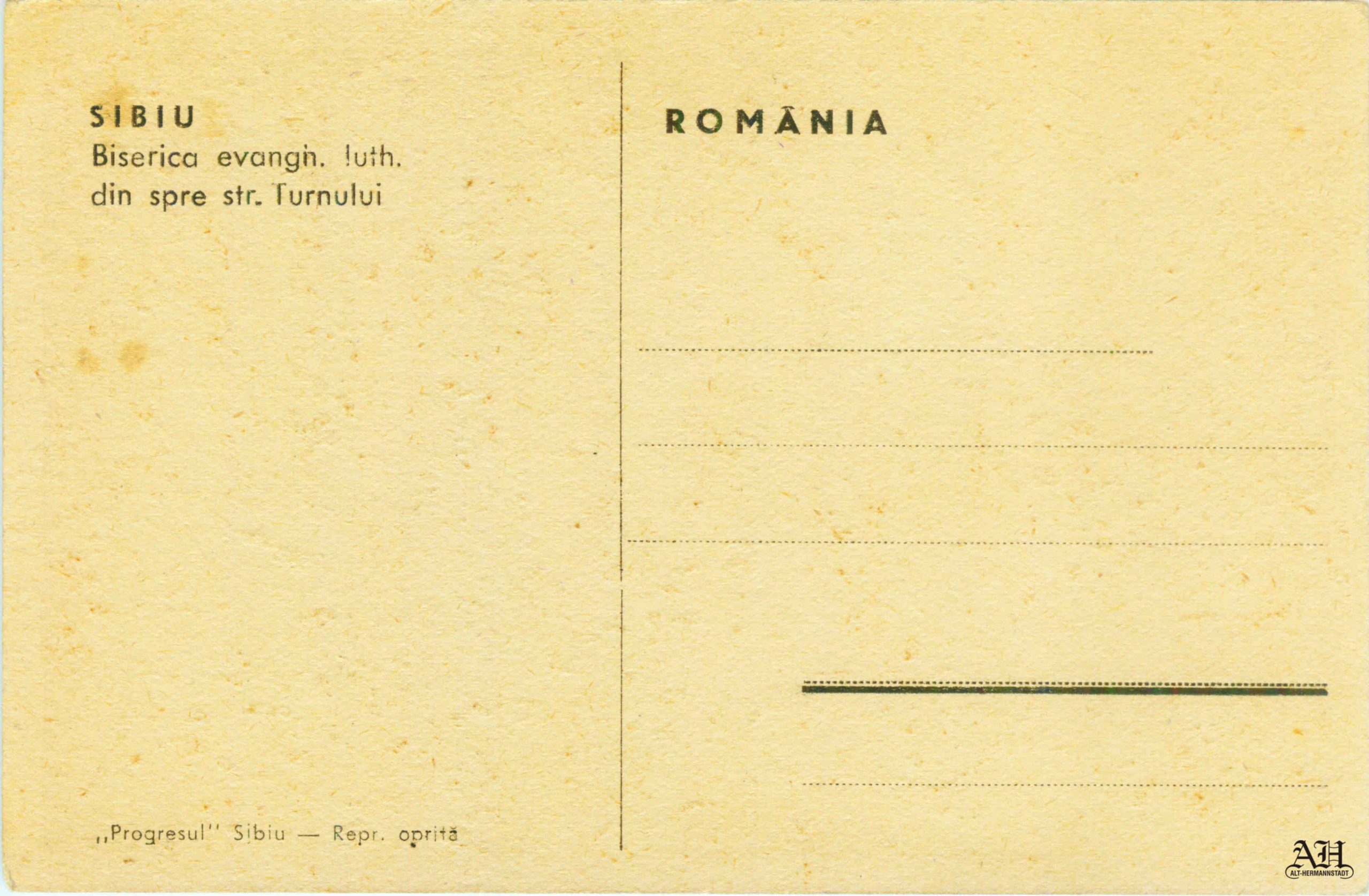Carte poștală tiparita la tipografia PROGRESUL Sibiu. Text verso: SIBIU Biserica evangh. luth. din spre str. Turnului / „Progresul“ Sibiu – Repr. Oprită. Intreprinderea Progresul a funcționat din 1944 până la naționalizare 1948 în clădirile fostei tipografii Krafft & Drotleff S.A. str. Regina Maria nr. 23.