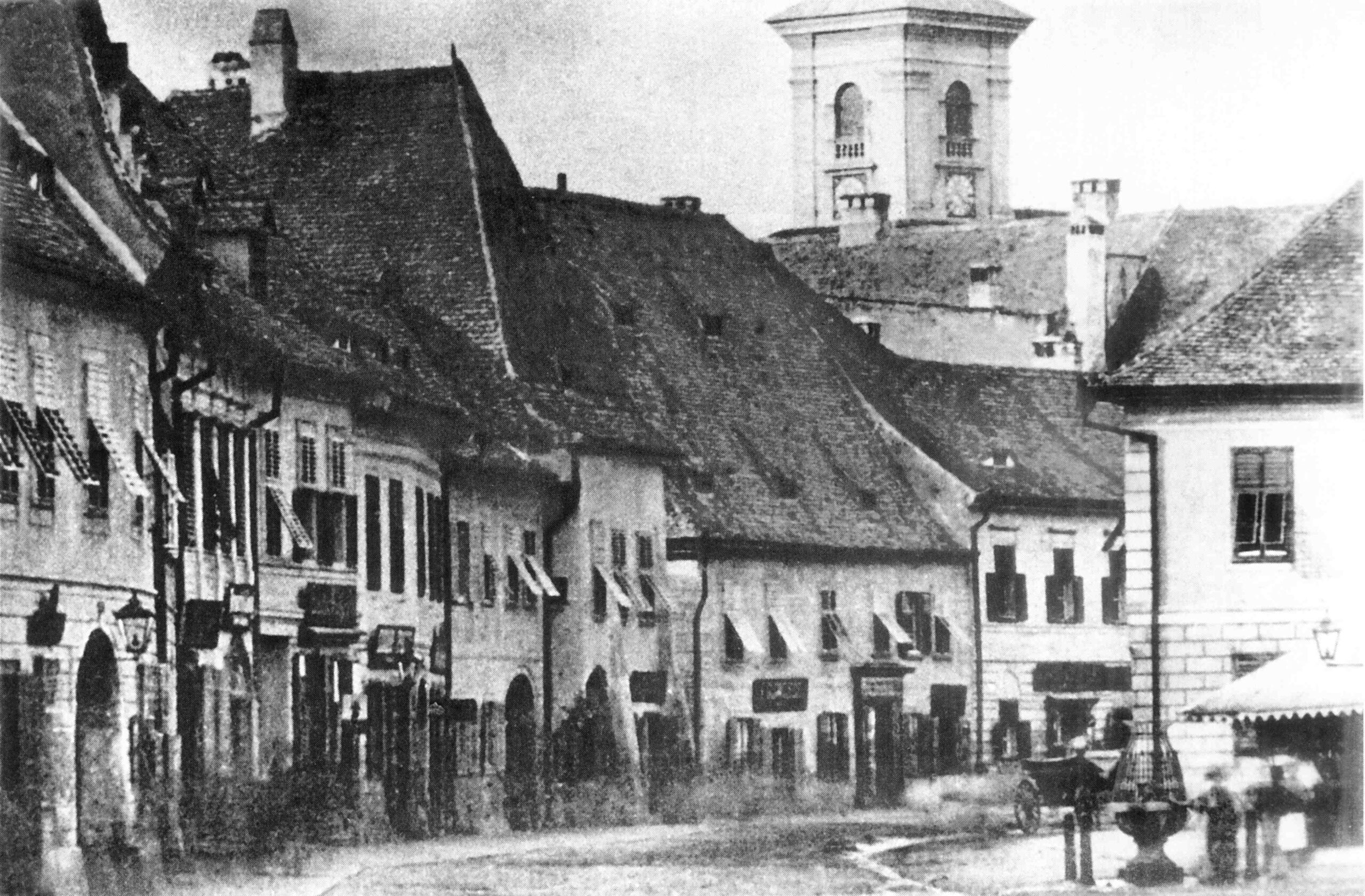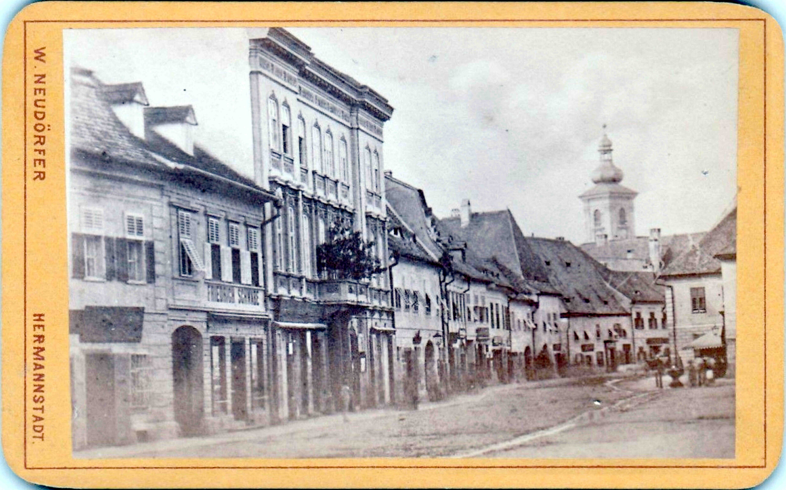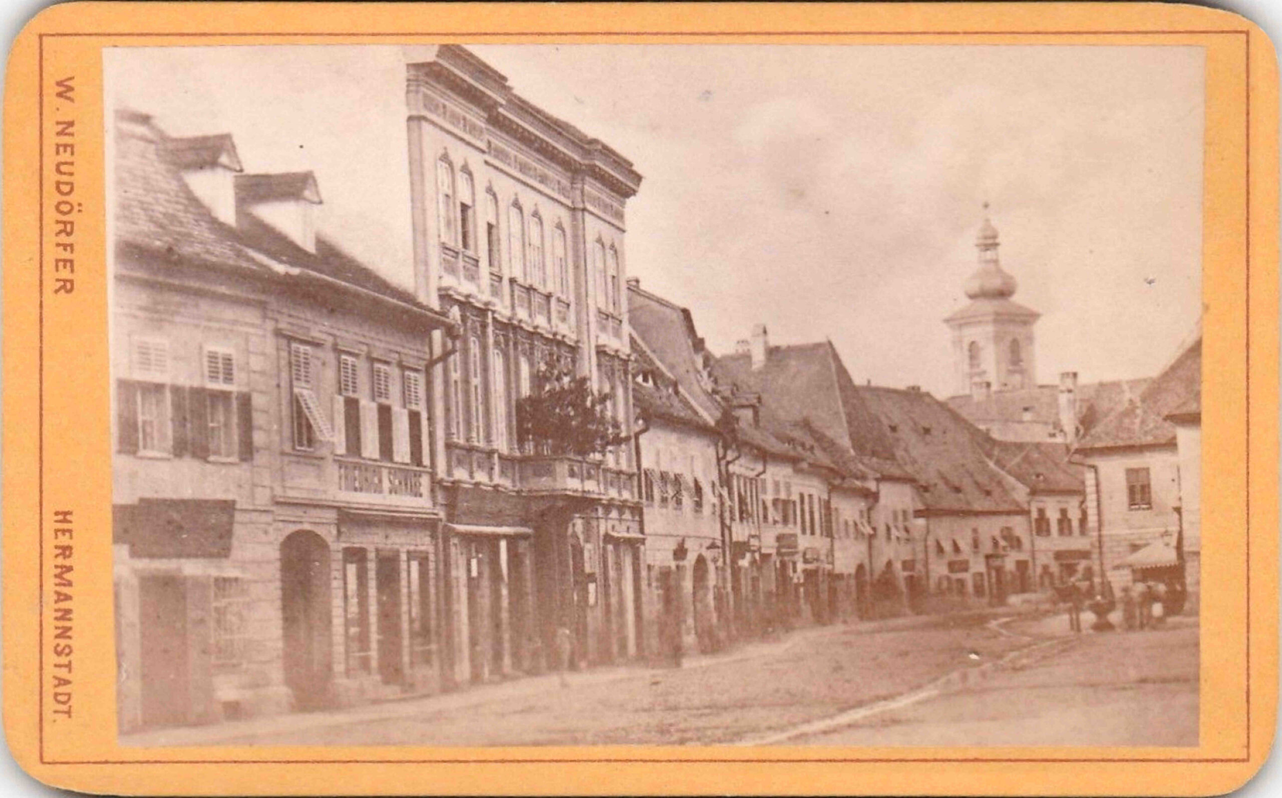 Această fotografie cu valoare documentară a fost realizată de fotograful Wilhelm Neudörfer pe strada Nicolae Bălcescu, probabil la sfârșitul anilor 1870. În fundal se vede turnul Bisericii Catolice din Piața Mare și în partea stângă a fotografiei o casă cu un coș mare de fum pe acoperiș. Este casa în care se afla vechiul hotel Împăratul Romanilor // Römischer Kaiser, demolată la 2 iulie 1891.