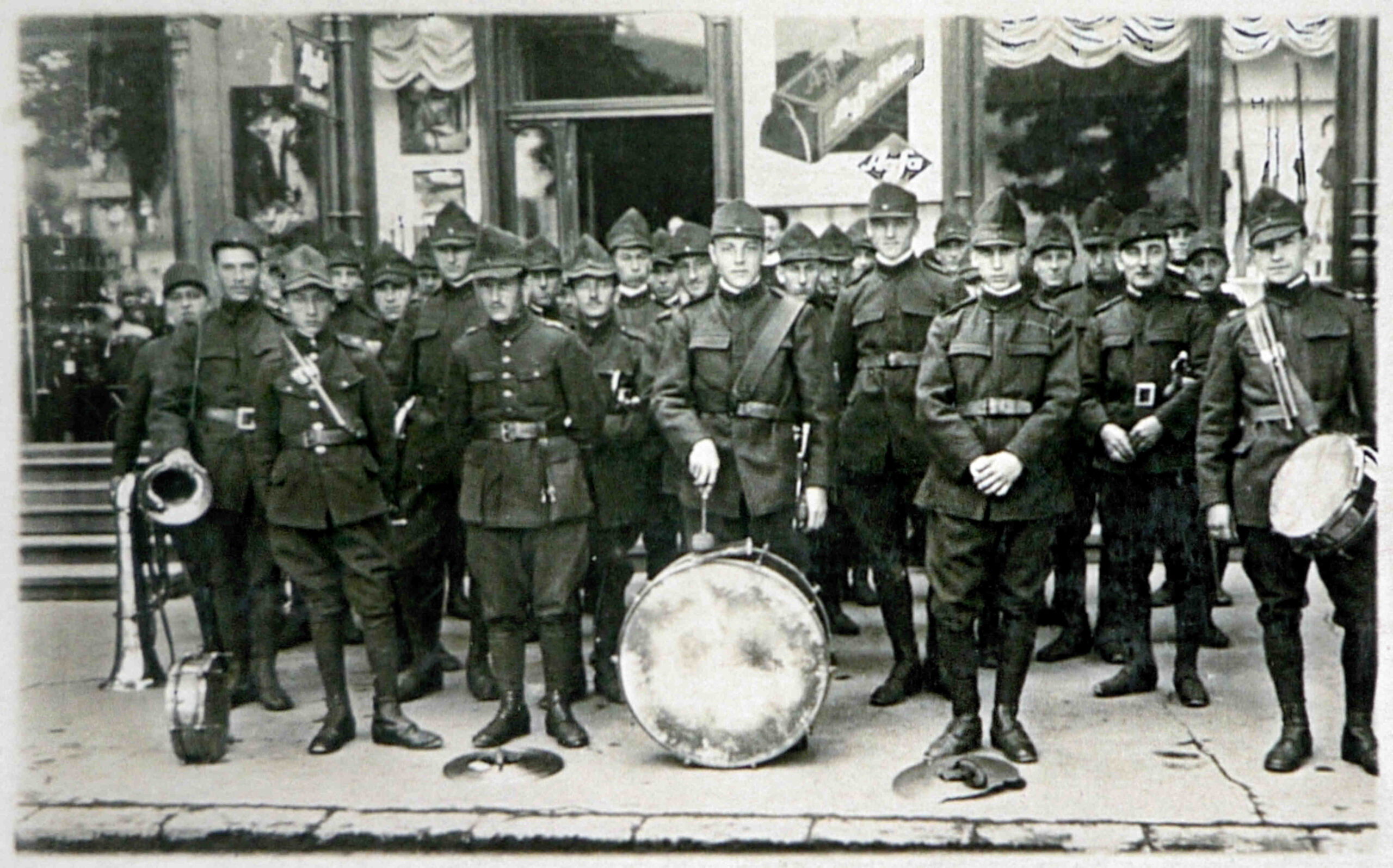 Fanfara militară a Regimentului 90 Infanterie din Sibiu fotografiată în Piața Mare de Emil Kirscher în 1929. Fotografie din arhiva grupului de facebook Alt-Hermannstadt.