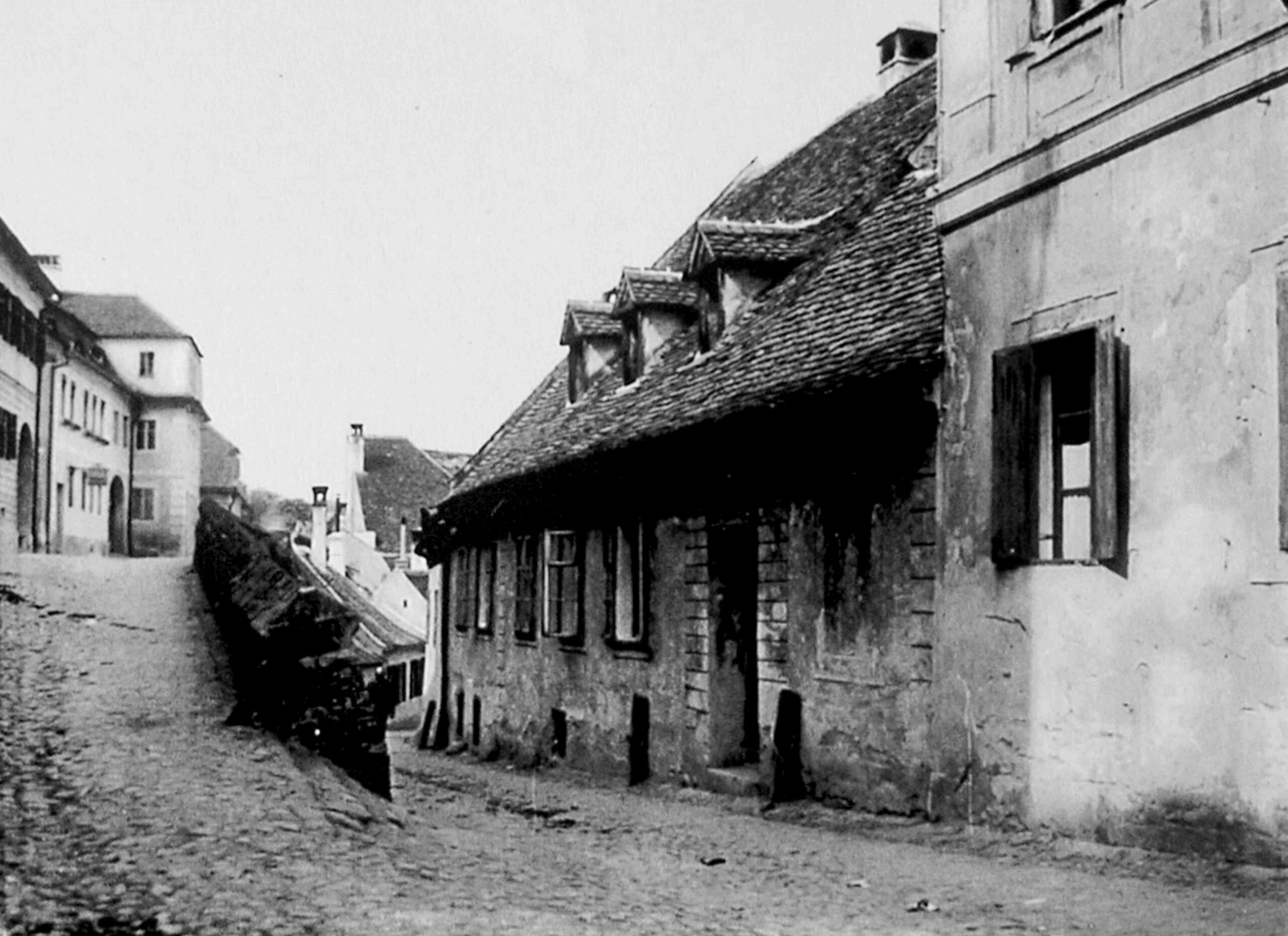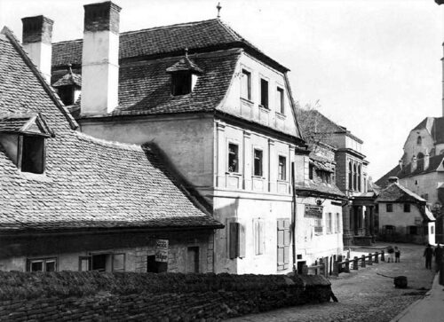 Casa cu lei din fostul ansamblu de clădiri „Groapa cu lei” str. Pempflinger // Alexandru Odobescu nr.18, demolată 1934. Spre Str. Moș Ion Roată, la etajul 2 al clădirii, se aflau două basoreliefuri pictate reprezentând tema biblică – Proorocul Daniel în Groapa cu lei. Fotografii realizate de Emil Fischer. (sursa foto: Alt-Hermannstadt)