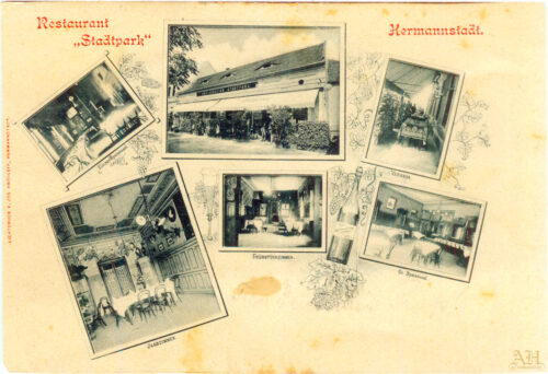 Această frumoasă carte poștală ilustrată, tip LEVELEZÖ-LAP, a fost tipătită la tipografia sibiană Josef Drotleff la începutul secolului al XX-lea. Cartea poștală din colecția privată Wolff este etichetată pe față cu textul, „Restaurant Stadtpark – Hermannstadt”. Pe verso se află textul scris cu creionul, „Herrn Dr. C. H. Wolf – Reichsratabgeordneter – Wien.”, care ne informează că această carte poștală a fost adresată domnului Dr. C. H. Wolf, deputat în Consiliul Imperial din Viena.