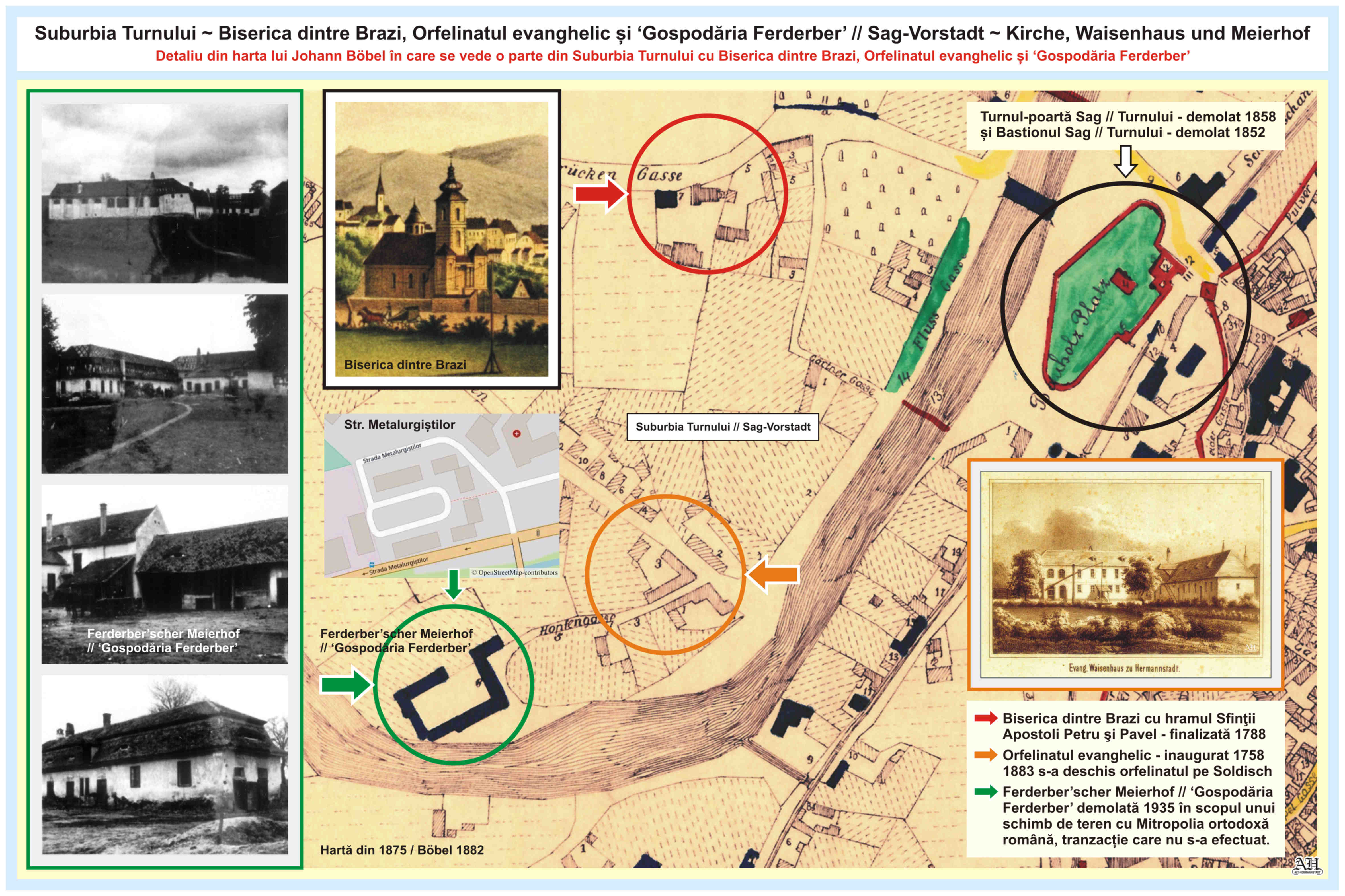 „Suburbia Turnului ~ Biserica dintre Brazi, Orfelinatul evanghelic și ‚Gospodăria Ferderber‘ // Sag-Vorstadt ~ Orthodoxe Kirche, Evang. Waisenhaus und Ferderber’scher Meierhof“