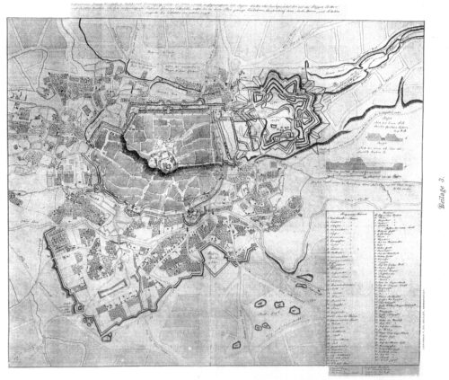 Von welchen allen aus den Plan Sub Litt. E von der Stadt, deren um solche in diesen Saeculo aufgeworfenen Envelopes, Basflanques, Retrenchements, und von dem Citadelle das weitere gnädigst zu ersehen seyn, mithin diese Visitation-Relation unterthänigst beschlossen wird.