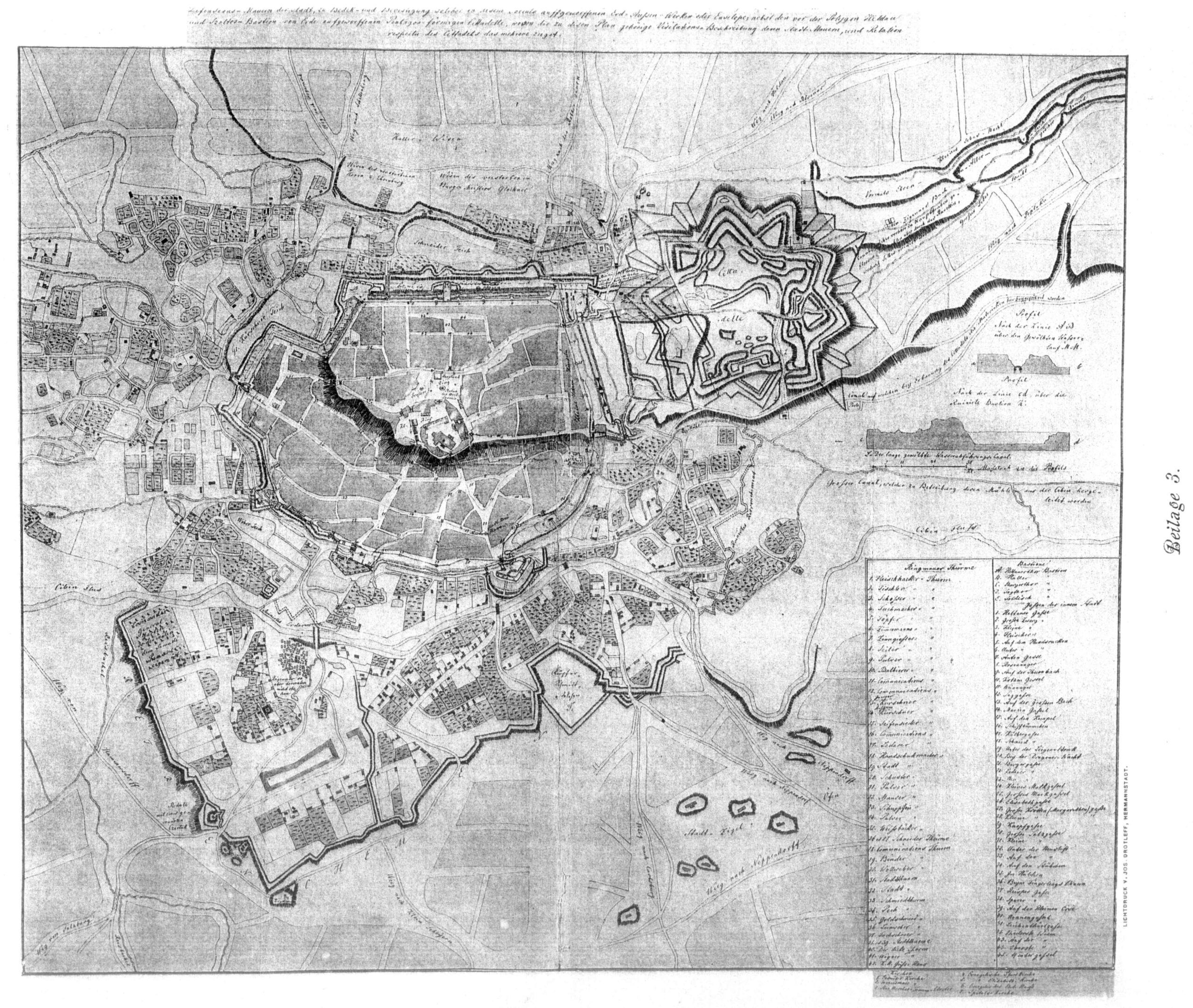 Es ist aber nicht allein diese sondern auch die übrigen 4 Bastions mit behörigen Graben nicht versehen, dahero weilen in lezten Rebellions Zeiten die Umstände, oder Zeit nicht zugelassen die Bastions Facen mit Controgardes zu bedecken, hat der Seelige Feld Marechal Rabutin um die Stadt ein Evelope-förmiges Erdwerke aufzuwerfen für nöthig erachtet, und sowohl bei dieser als übrigen Bastions niedrige Flanques angeleget, welche aber der Zeit hero mit dem Envelope selber zu Grund gegangen seynd.