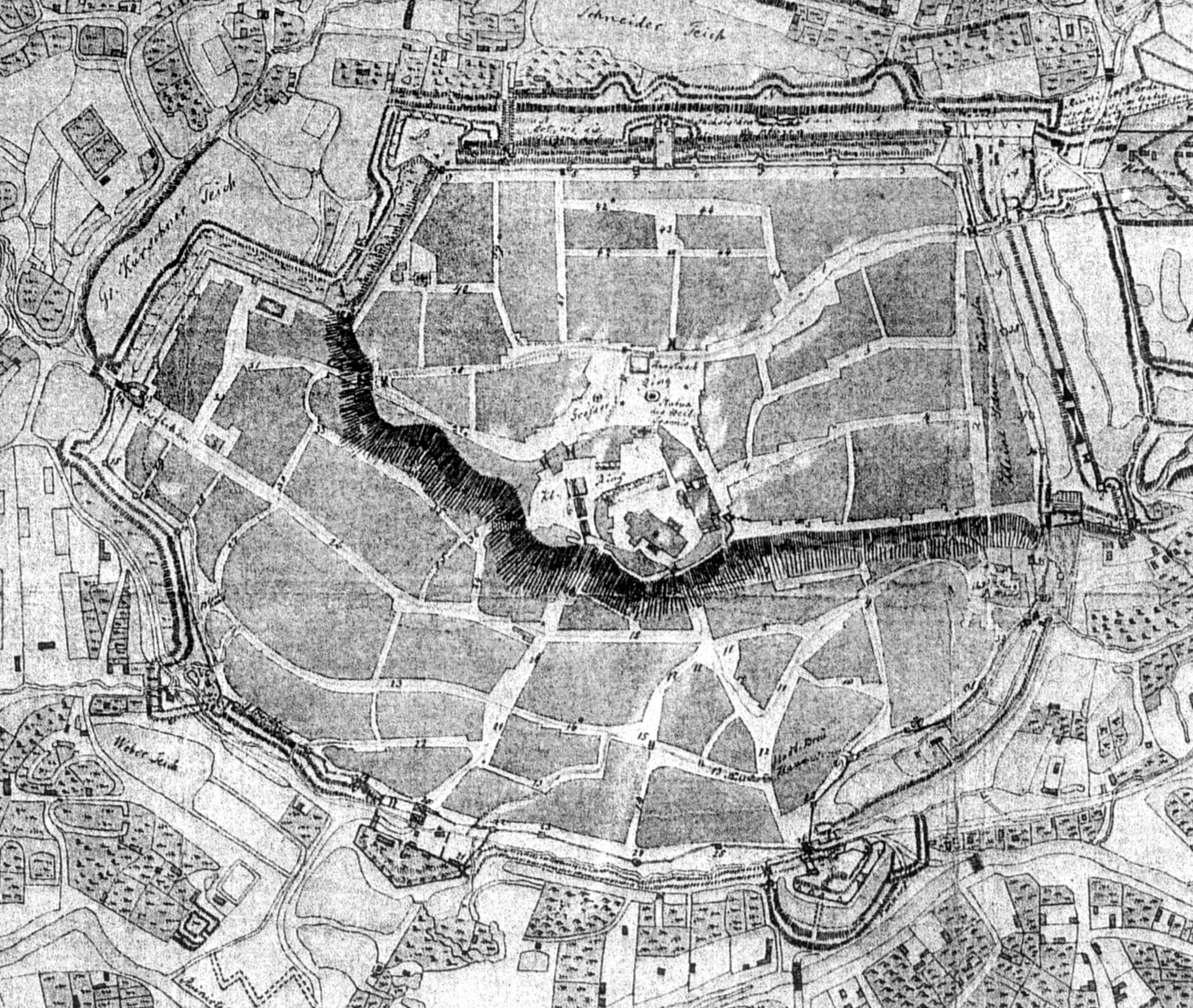 Weiters nach solchen ist abermalen ein Blockhaus auf der Stadt Mauer so in schlechten Stand, wie dann auch die Stadt oder Ring Mauer, die hier Orts ohnehin sehr baufällig wegen Excavirung der Erde in noch größeren Schaden versezet worden ist, ihr Figur bestehet allhier in kurtz gebrochenen Linien, und der dick an dem Blokhaus oder Comunications Thurm durch die Mauer ausfließende Canal ist mit einen von Rebellions Zeiten her bestehenden Fallgatter versehen, welcher aber gänzlichen verfaulet, also zwar, daß man mit leichter Mühe in und aus der Stadt practiciren kann, so ist auch die Stadt Mauer ober der Mündung des Canals sehr gestalten.