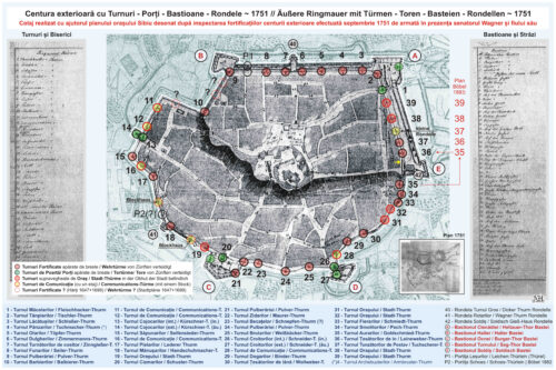 În planul orașului Sibiu întocmit cu această ocazie au fost notate denumirile construcțiilor de fortificație ale centurii exterioare: turnuri, porți, bastioane, dar și edificii sacrale, biserici și străzi existente în Sibiu 1751.